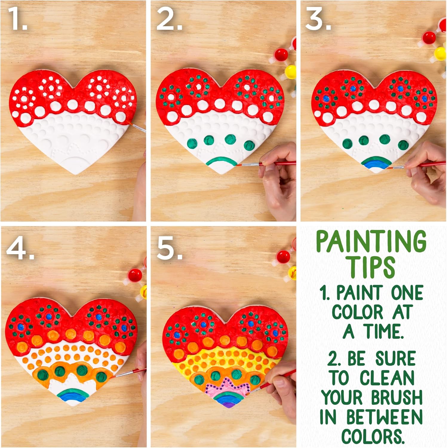 - SET INCLUDES: 1 Ready-to-Paint Ceramic Heart Stepping Stone (7 in x 1 in x 7 in), 1 Acrylic Paint Strip (Red, Yellow, Green, Blue, White, Black, 2.2mL each), 1 Paintbrush, Easy-to-Follow Instructions
