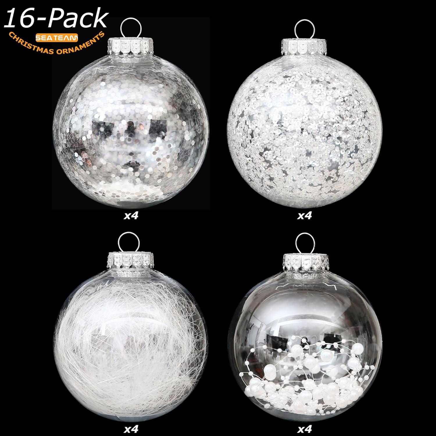 Sea Team Shatterproof Clear Plastic Christmas Ball Ornaments Decorative Xmas Balls Baubles Set with Stuffed Delicate Decorations (100mm/3.94''/16-Pack, White)