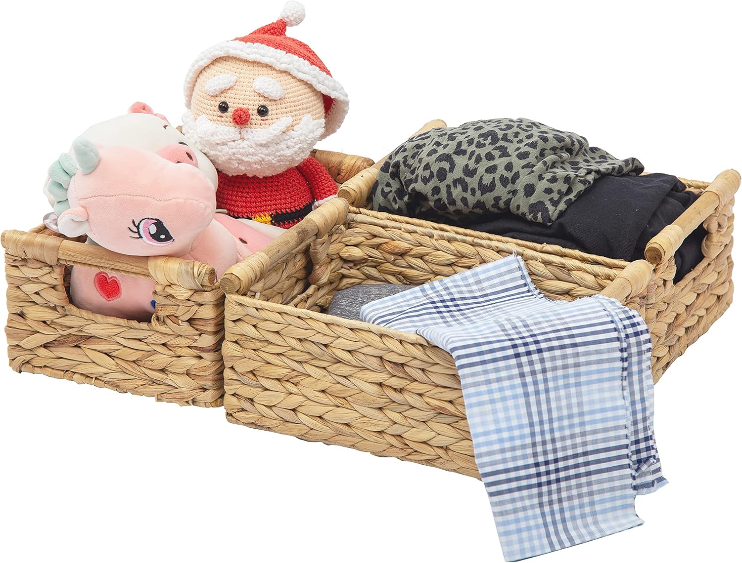 - ā Natural & High Quality - Our small rectangle basket storage are made of Water Hyacinth, an all-natural and easily renewable resource with an iron frame for sturdy storage. The wooden handles on both sides are not only pretty but to help you easy to carry the wicker basket.