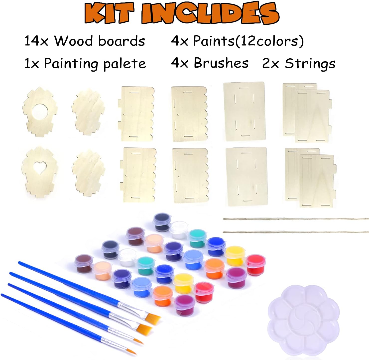 - Complete Birdhouse Kit: This package includes 2 unassembled birdhouses, 12 x 2 paint colors, 4 brushes, 1 painting palette, 2 strings—everything you need to build and decorate your own birdhouses