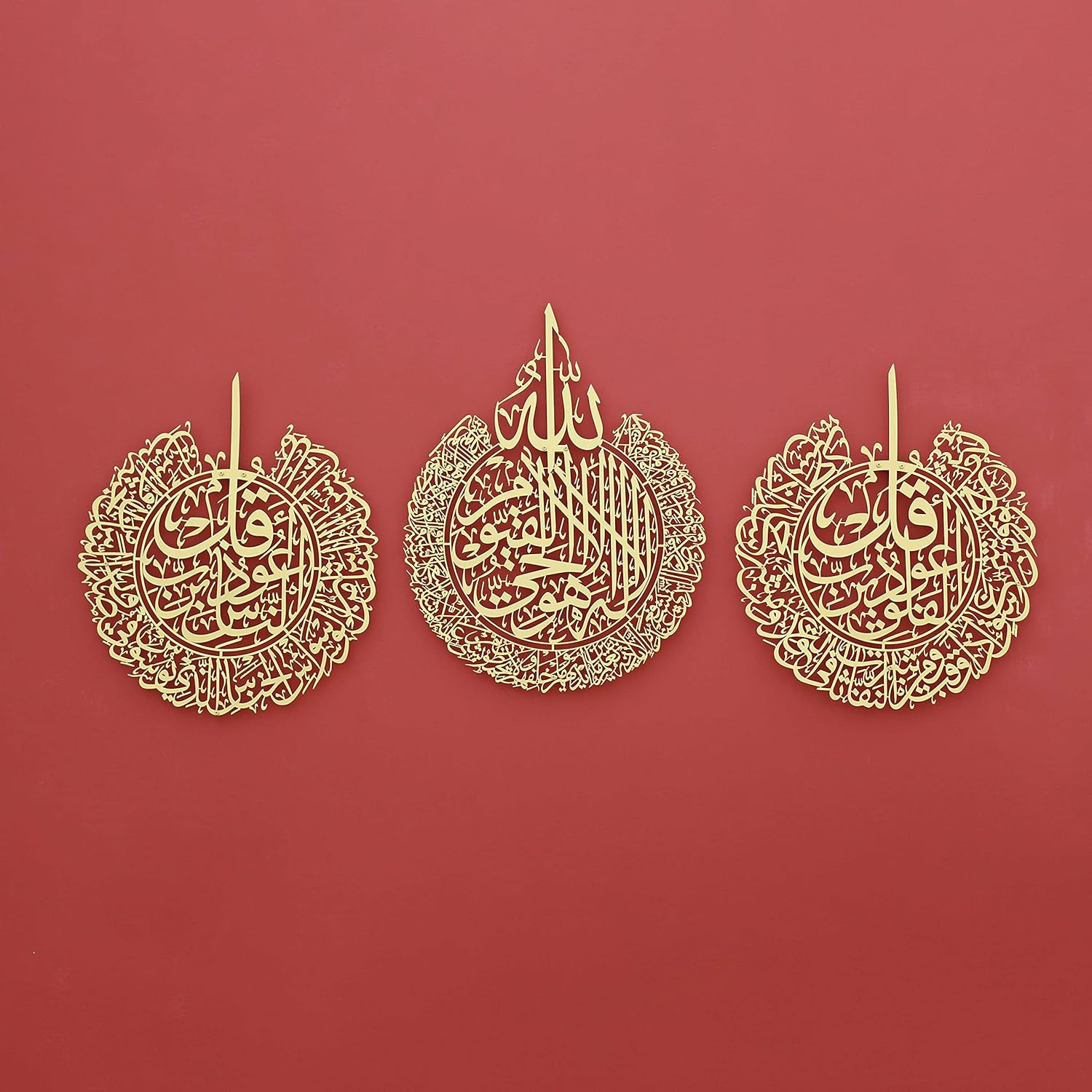 - The Elegance of Art: Crown your home with this elegant metal Islamic wall art. Featuring the Ayat al-Kursi, Surahs al-Falaq, and al-Nas, it's a magnificent union of Quranic verses and masterful Arabic calligraphy.