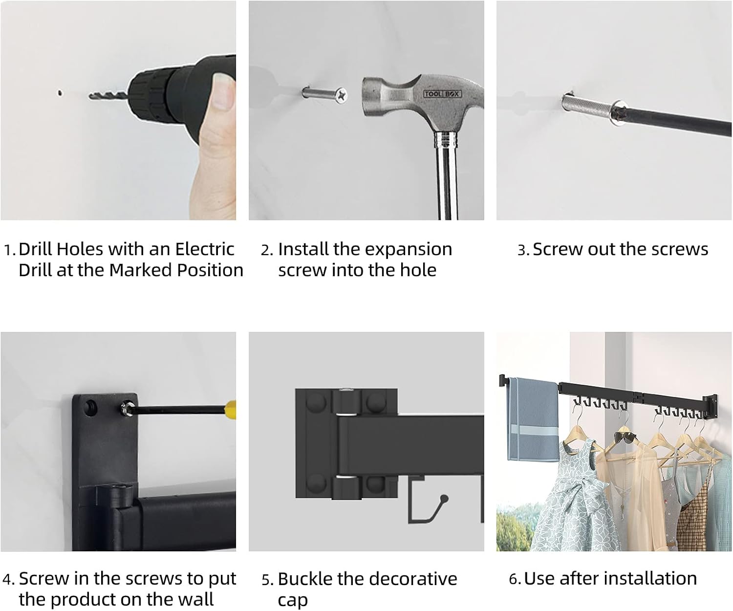 - âś… Punch-free & Drilling Installation to Choose -- Whether you prefer a punch-free installation (With No-Drill Adhesive: Clothing Weightâ©˝60 LBS) or traditional drilling, our clothes drying rack wall mounted offers simple installation methods suitable for various surfaces, including smooth ceramic tiles, ensuring it fits perfectly in your space. (Tips: Please make sure the wall or wood board is solid before installation.)