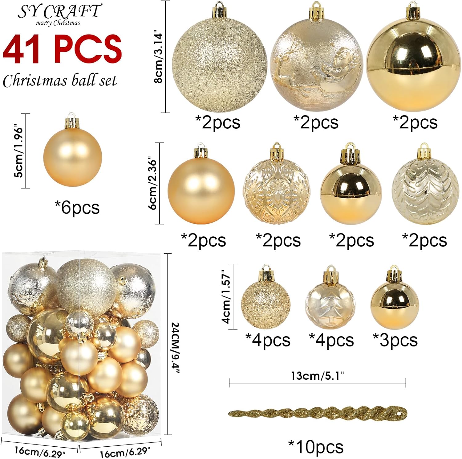 - *[BALL SIZE]The set has 4 extra large balls 3.14", 10 large balls 2.36", 6 medium balls 1.96'', 11 small balls 1.57'', 10 ice bar pendants, Christmas Balls are in 11 Different Colors,Each Barrel Contains 41 Pieces,great to Hang on the Top part or to fill Small Place of Big Trees.