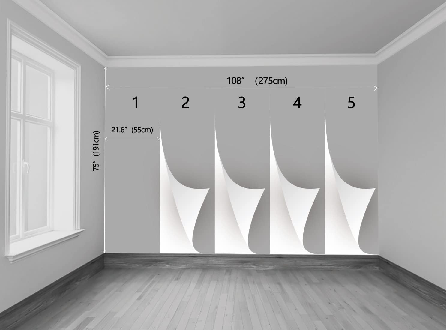 - Dimension This mural wallpaper is cut into 5 pieces for easy installation, each in 21.6"x75",total size is 108"x75"(275x191cm)(W x H). Each piece is marked with a number. You can place it in order during install it.