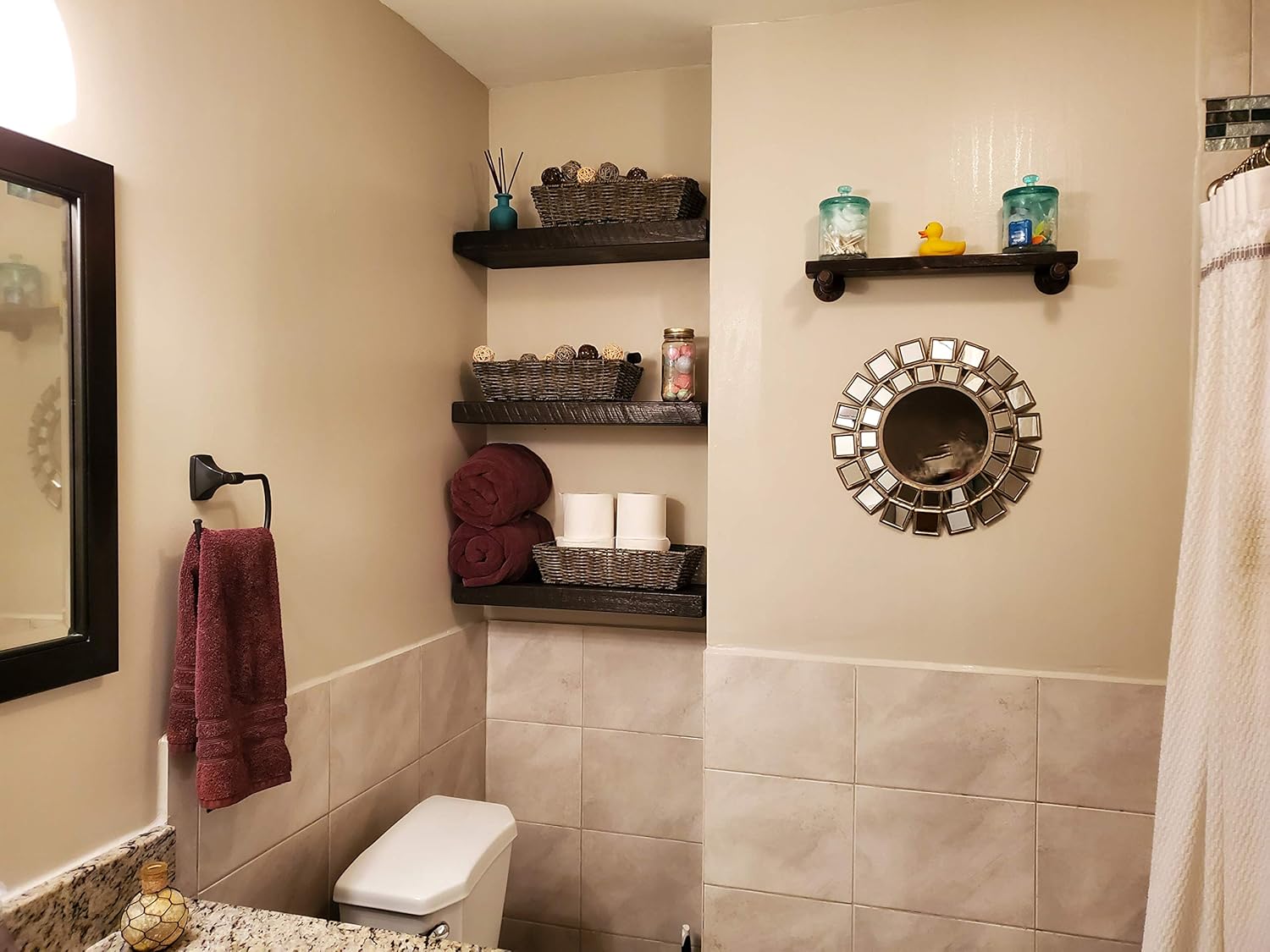 - Elevate Your Space with Rustic Charm: Transform your living room or any space with our large floating shelves for wall. These 18 inch floating shelf beauties, crafted from natural wood, add a touch of rustic warmth and provide ample display space for your cherished items. These are a great depth for photos, and organizing small areas. NOTE: You need to be able to hit one wood stud toward the center of where you want to hang the shelf.