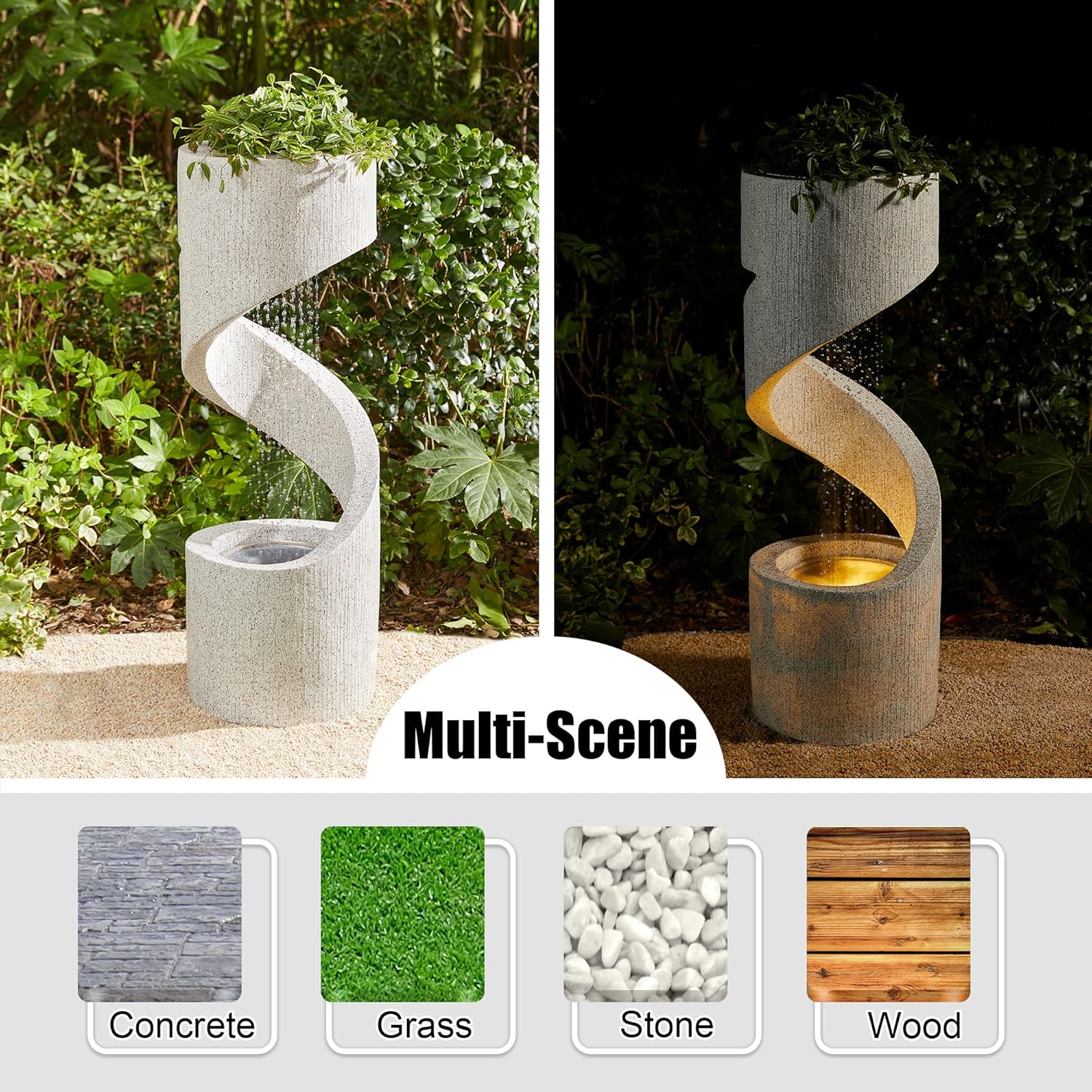 Glitzhome Decorative Tiered Outdoor Water Fountain with LED Light Vintage Curved Waterfall Fountain with Stone Planter Rustic Faux Terrazzo Spiral Shaped Fountains for Garden Patio Deck Porch, 40.25”H