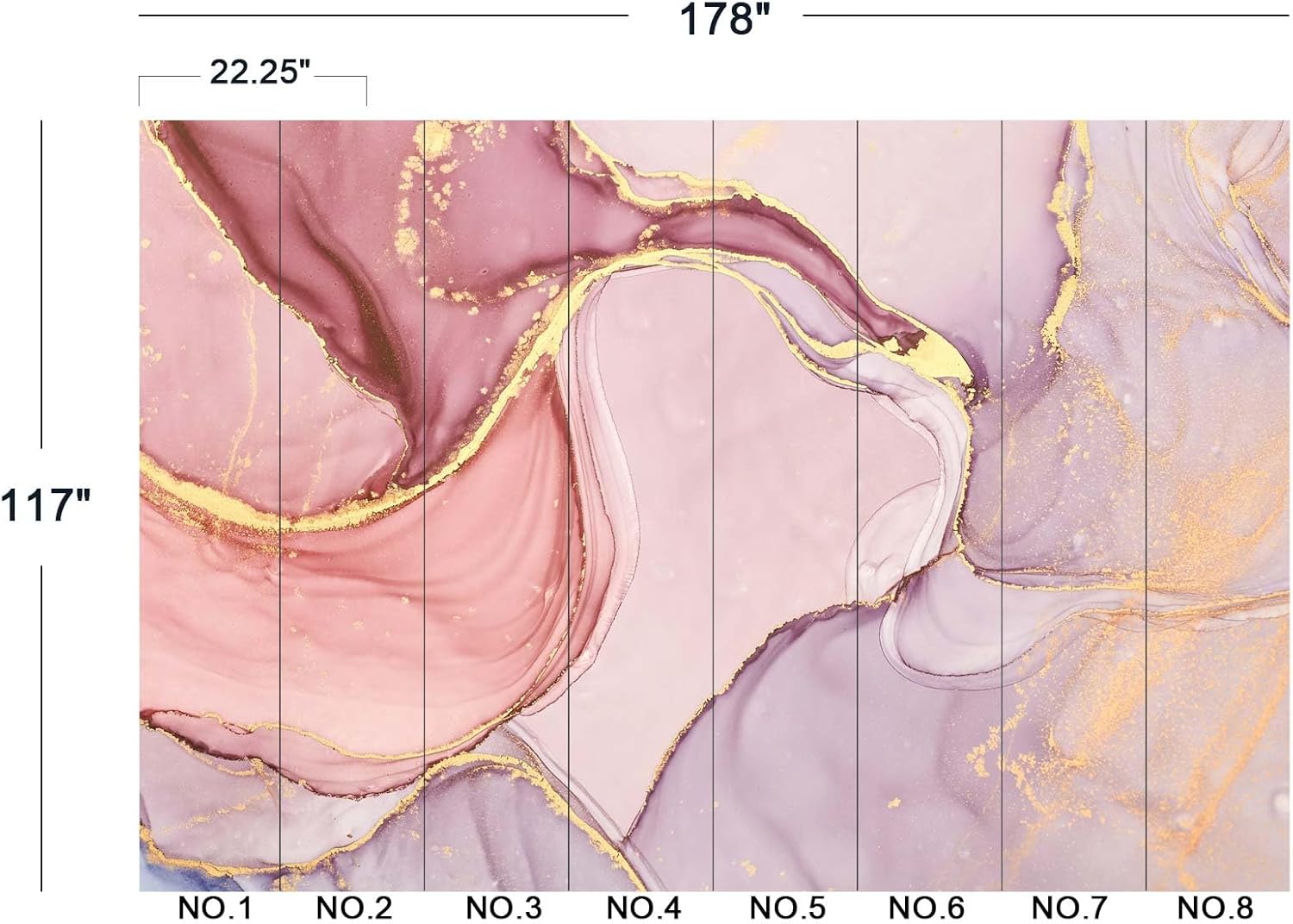 - The size of the wallpaper is 178" wide x 117" high and divided into 8 panels.