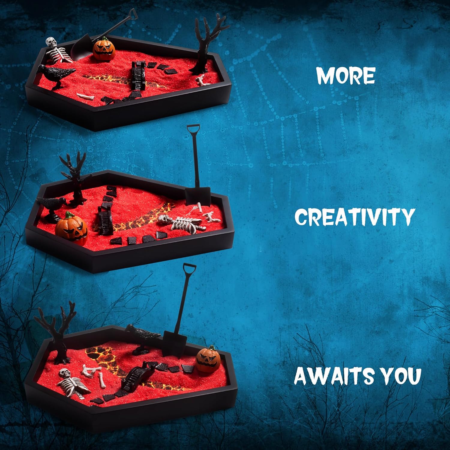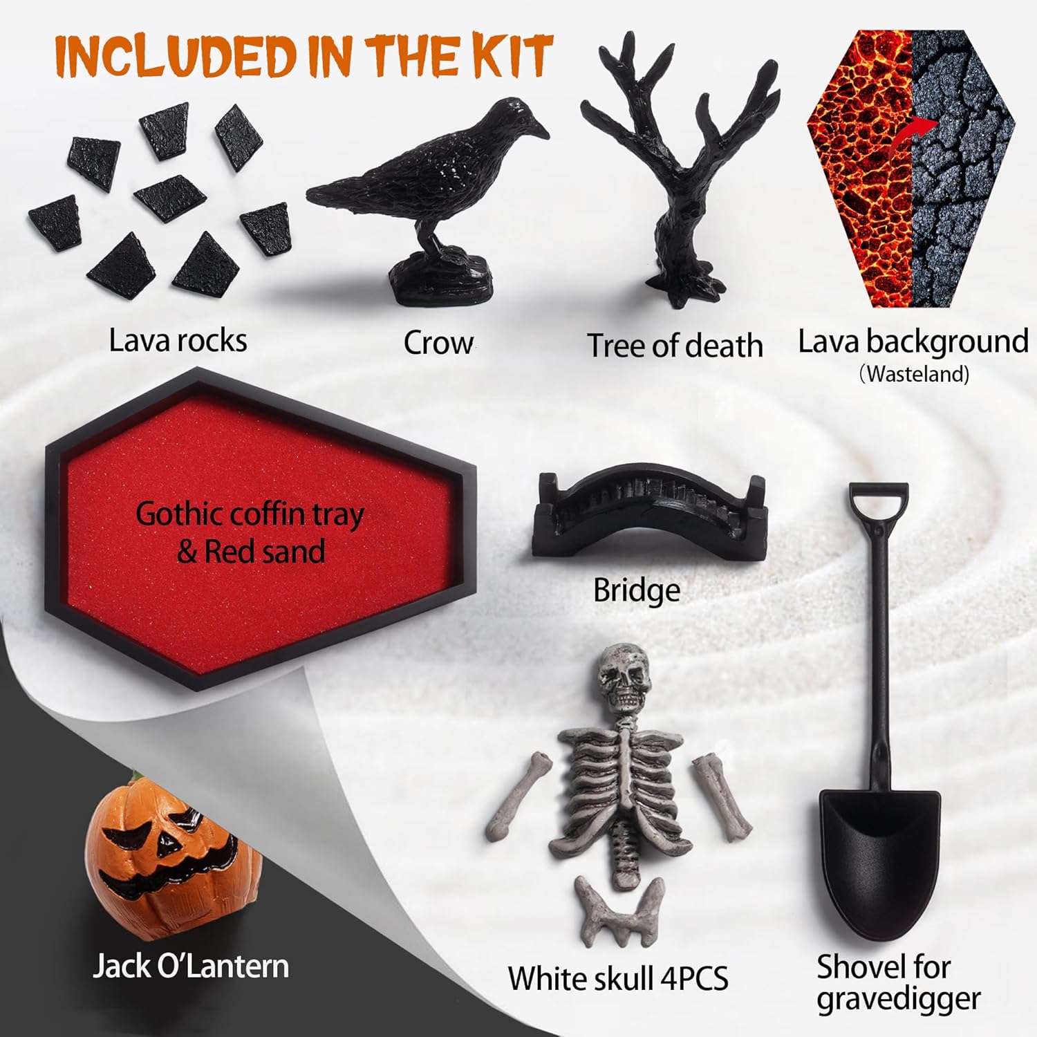 - š DIY: Our Halloween Coffin Zen Garden is designed to resemble a traditional coffin.This product has 9 accessories including 1 Gothic coffin tray, 1 bridge, 1 bag of red sand, several pieces of molten rock, crows, a shovel, a dead tree, a half skeleton, and a base image of molten rock. On the special holiday of Halloween, you can place your imagined hell world, the intersection of life and death, and so on in any corner of your home to present the atmosphere of Halloween you want. Any artistic conception you want to express can be created by yourself.