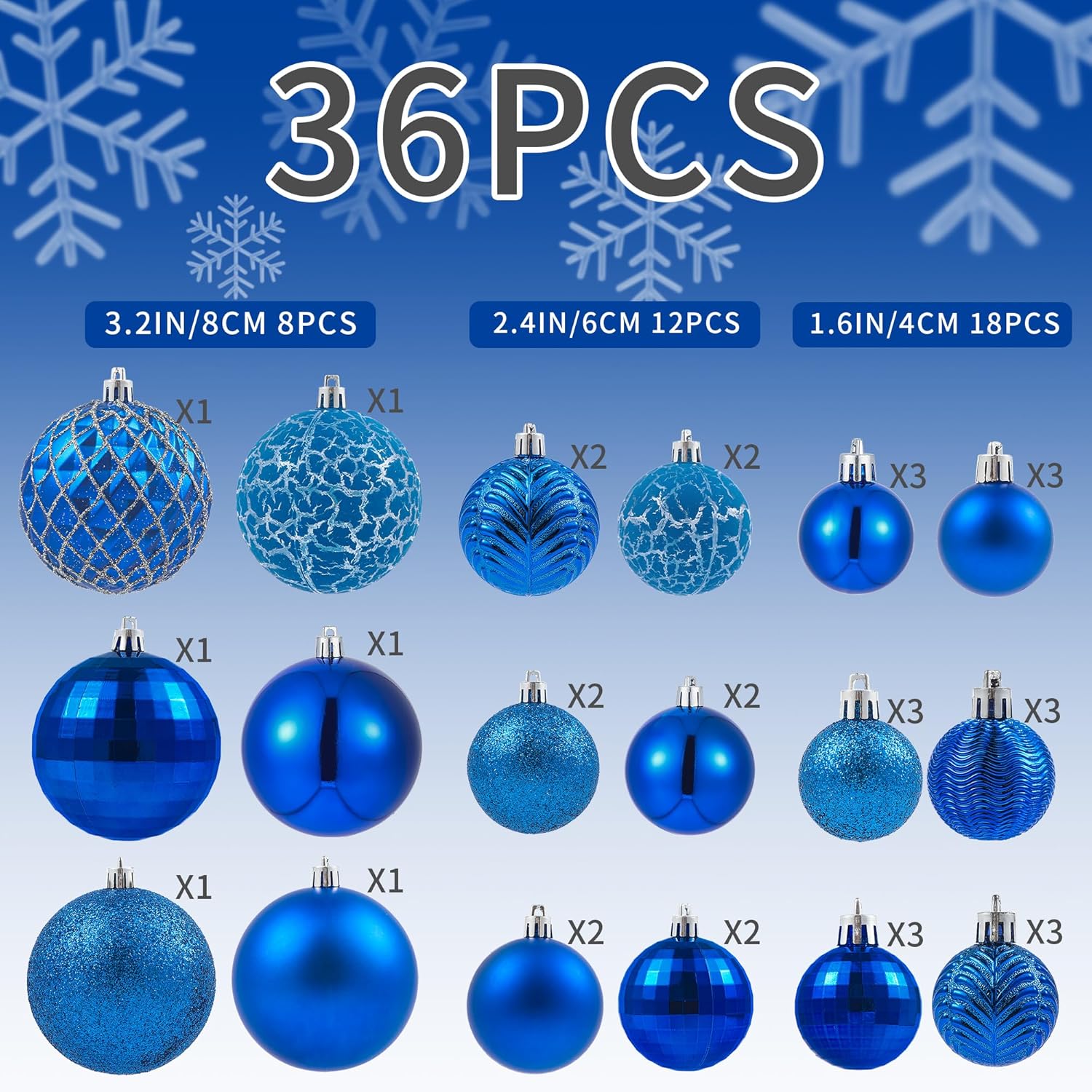- Multiple Style Matching - With 3 sizes and 18 different styles, the LANGXUN Copper Orange Christmas ornaments balls set includes a total of 36 balls. This set features 8 balls measuring 3.2 inches, 12 balls measuring 2.4 inches, and 18 balls measuring 1.6 inches.