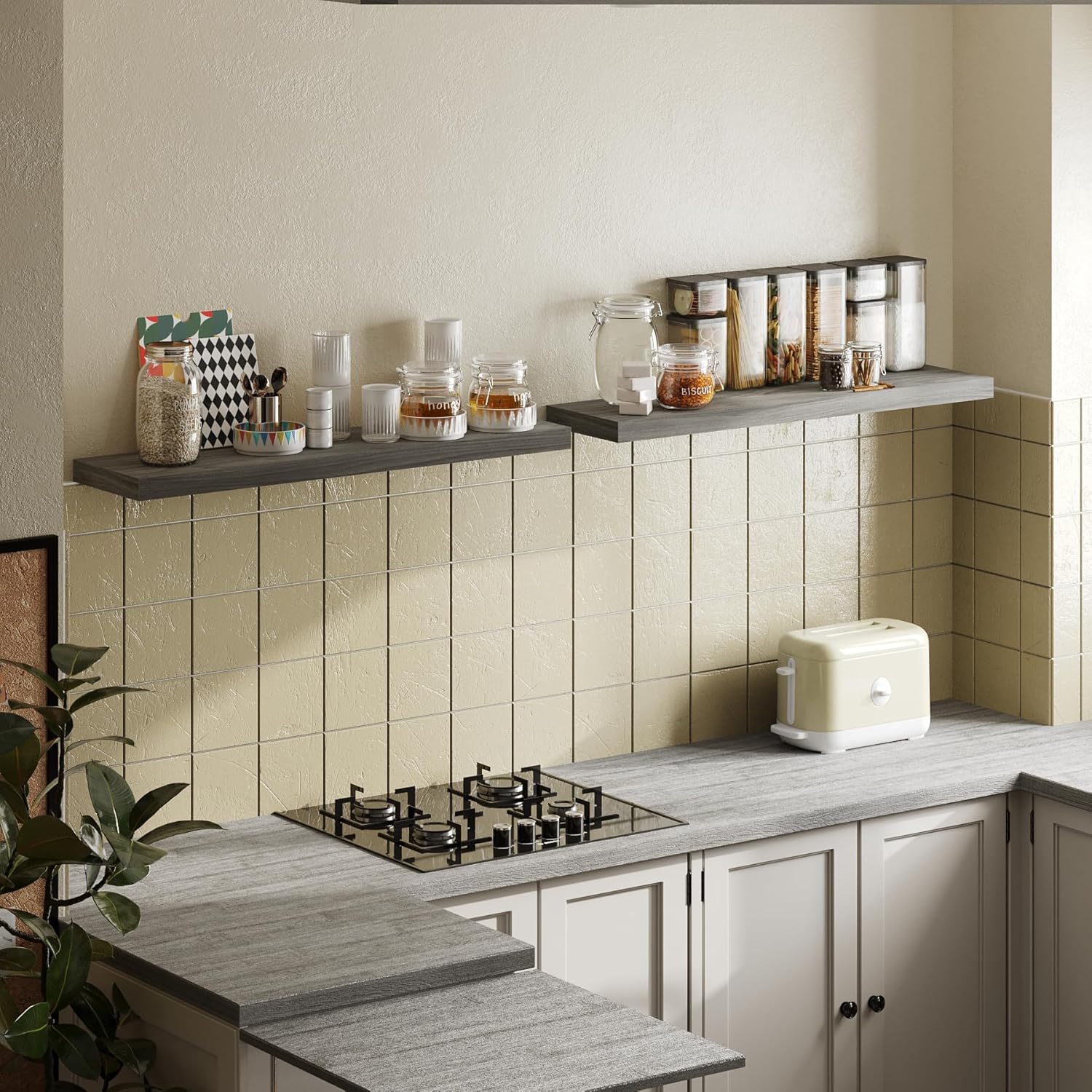 - ăGREAT FOR ANY ROOMăOur wood floating shelves are made of MDF with a frosted surface texture for a mordern feel that blends perfectly into a variety of different scenes. Having this large floating shelf not only for its decoration effect, but also for its high practicality. It can be used for organizing all household rooms, such as bedroom, living room, study, toilet, cloakroom, even kitchen and warehouse.