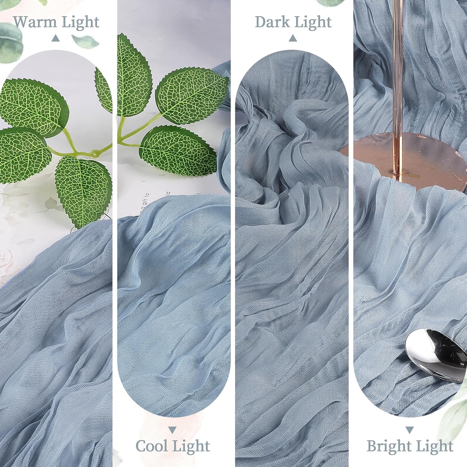 - PACKAGE INCLUDED: You will receive 12 pieces of dusty blue cheesecloth table runners. Elegant and beautiful design, exquisite workmanship. Product size: Each boho table runner is 35 x 120 inches. Enough to cover rectangles and round tables, as well as long tables that are stitched together. It can even be used to belt chairs decorate napkins, background curtains. Round or square tables for 8-10 people, perfect for romantic and elegant party events