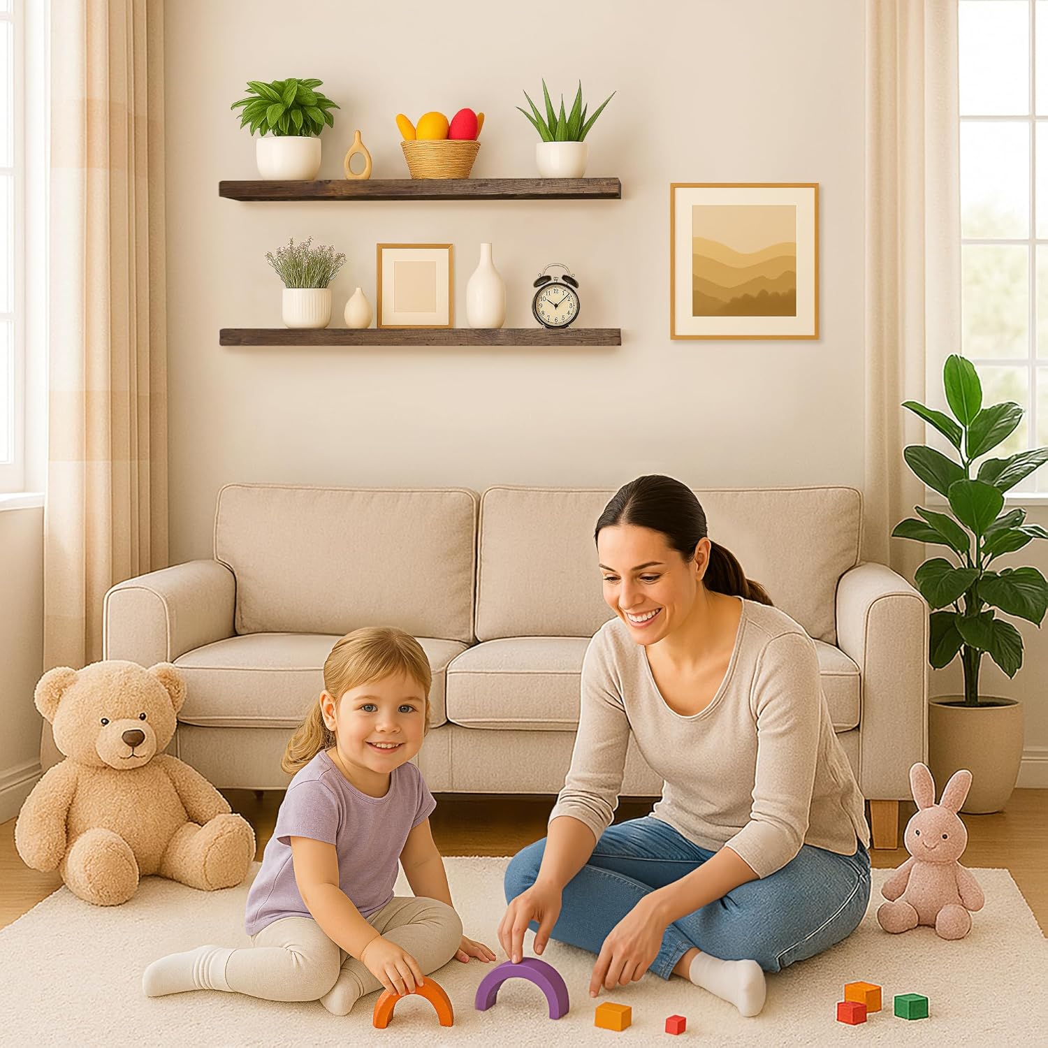 - MODERN RUSTIC LOOK - The floating shelves are made of natural pine, and the wood has different nodes and grains, so the color of each shelf may be slightly different, but equally stunning!