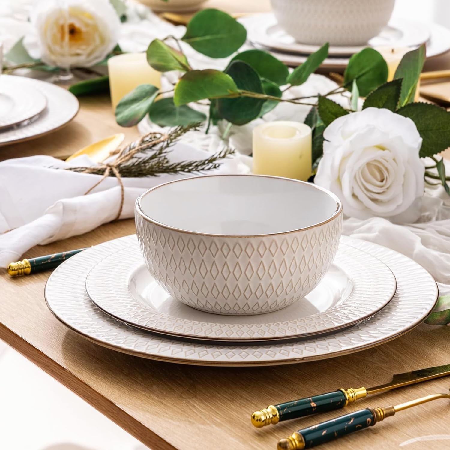 • UNIQUE MODERN DESIGN: Our 12-piece ceramic dinnerware set features a modern and elegant embossment design, allowing your dinner plate and bowl to be the star of the table. The glaze is pure snow-white with light embossment, and darkened rims, which look ultra classy and beautiful. This white dinnerware set is durable enough for everyday use for the family, yet sophisticated enough for that important dinner party or special event. Perfect for wedding and housewarming gifts.