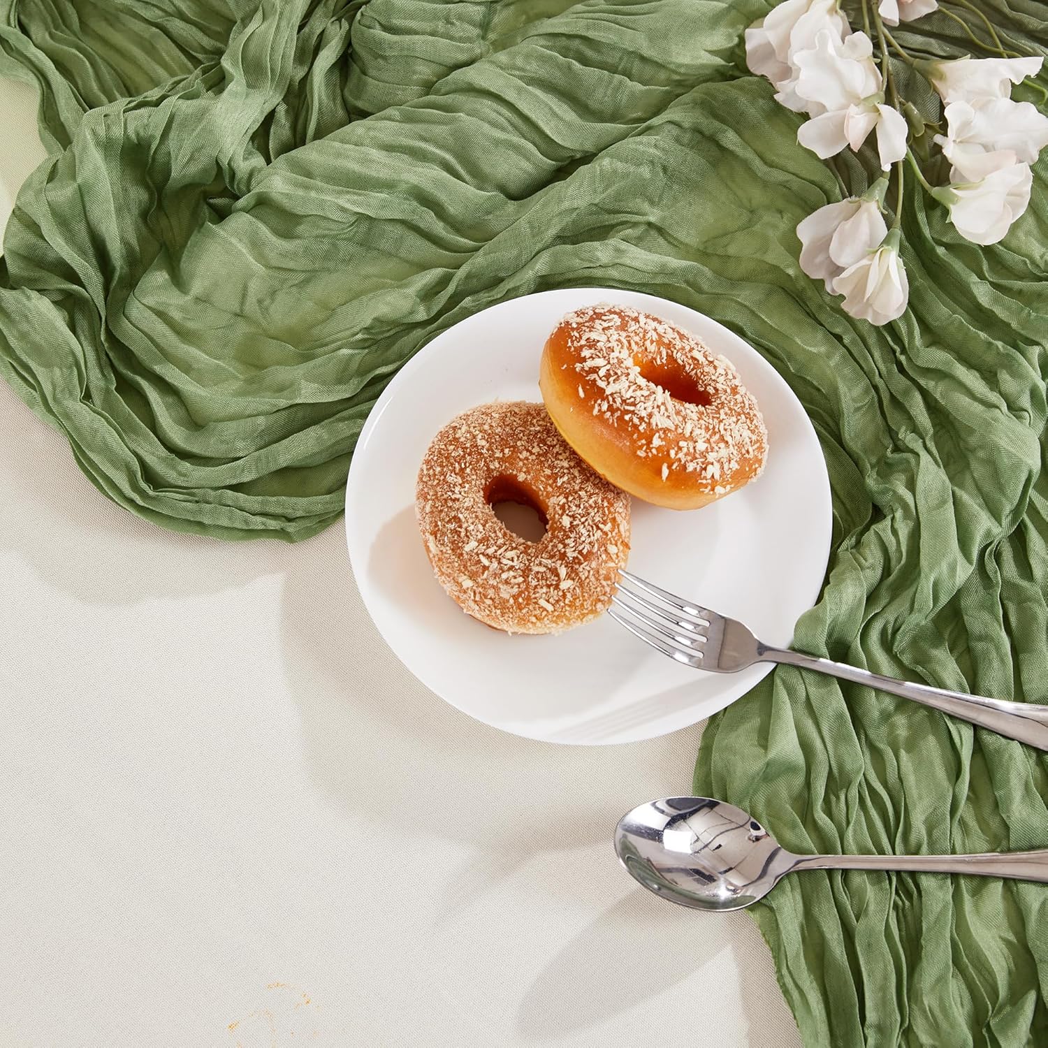 - PACKAGE INCLUDED: You will receive 12 pieces of sage green cheesecloth table runners. Elegant and beautiful design, exquisite workmanship. Product size: Each boho table runner is 35 x 120 inches. Enough to cover rectangles and round tables, as well as long tables that are stitched together. It can even be used to belt chairs decorate napkins, background curtains. Round or square tables for 8-10 people, perfect for romantic and elegant party events