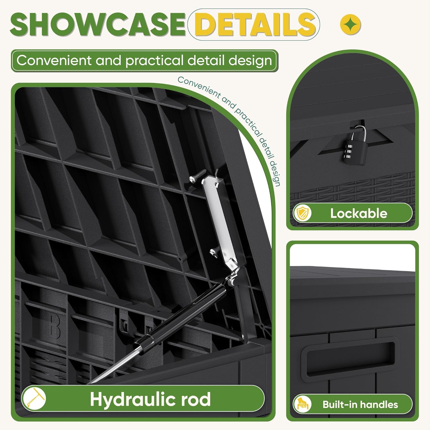 - WIDE VERSATILITY: The 100 gallon storage box can not only help you organize your patio or lawn. It can also be used as a table or bench when you need it, and the lid is equipped with a support bar inside, which can greatly enhance the stability and weight-bearing capacity of the storage box.
