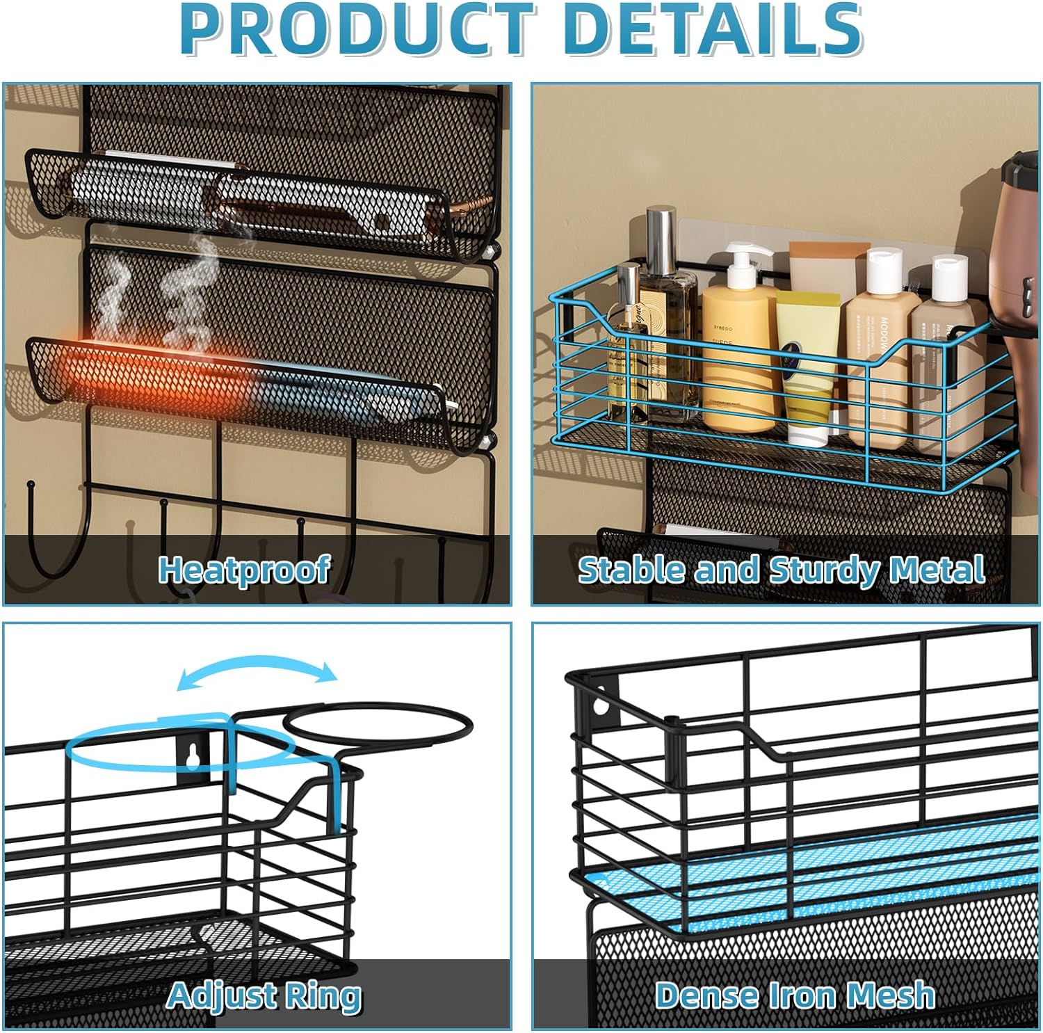 - 【1 Basket/3 tier Shelf】The hair tool organizer includes 1 metal basket, 2 mesh holders, 1 hairdryer holder, and 1-row hook. Separate all your hair tools, such as curling iron, blow dryer, straightener, etc.