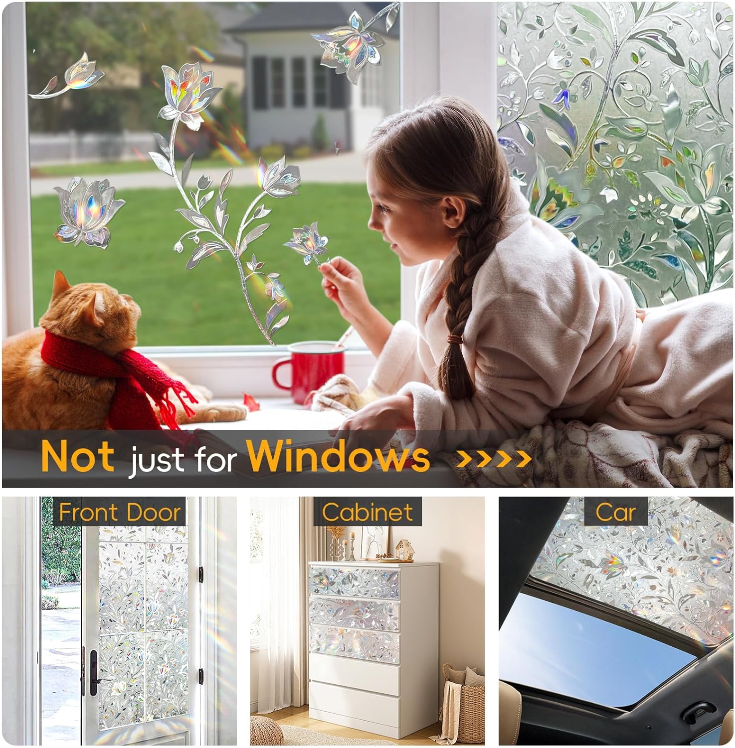 - Static Cling Window Film: This rainbow window clings for glass windows is non-adhesive. Window rainbow film for window can be directly installed with water, leaving no residue after removing peel and stick window film, and the window decals for glass windows can even be reused many times! Window coverings film is suitable for rental houses.