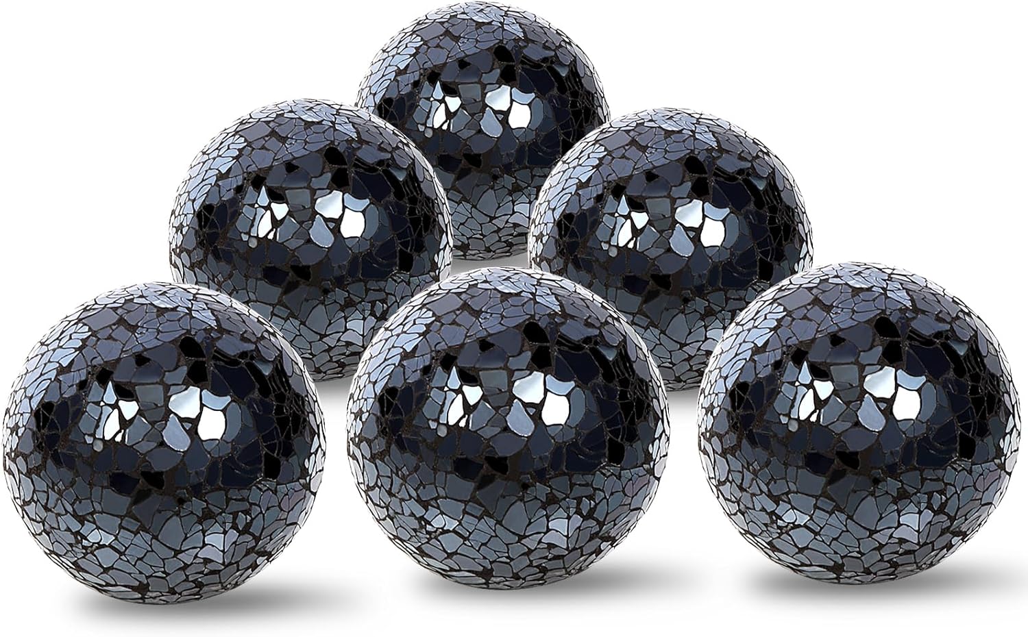 6pc Decorative Ball Set - 6cm/2.4inch Mosaic Glass Orbs for Centerpieces, Table Decor, Wedding Party (Black)