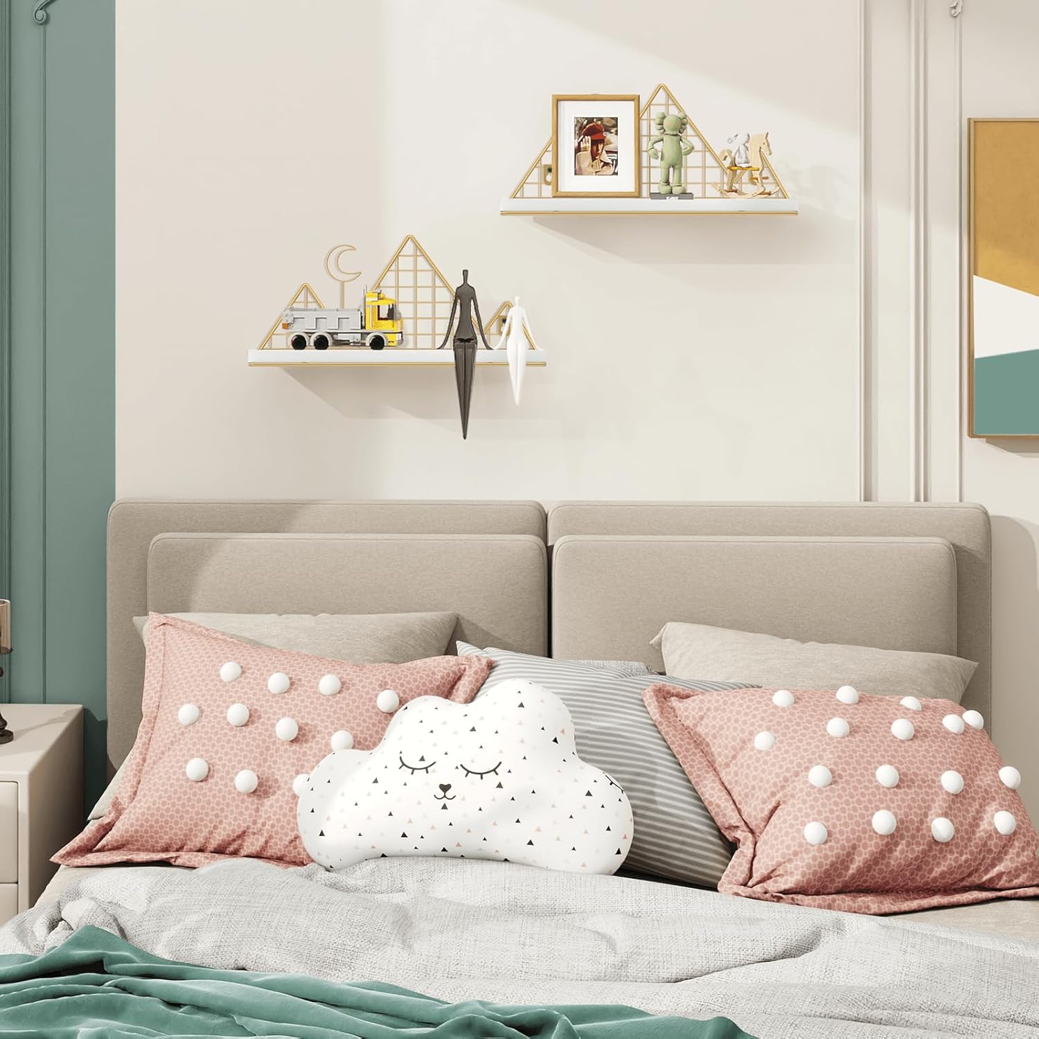 - Functional and Stylish Storage: Perfect for displaying photos, books, toys, toiletries, plants and decorative items. These decorative wall shelves for bedroom are designed to hold your essentials while adding a unique charm to your decor.