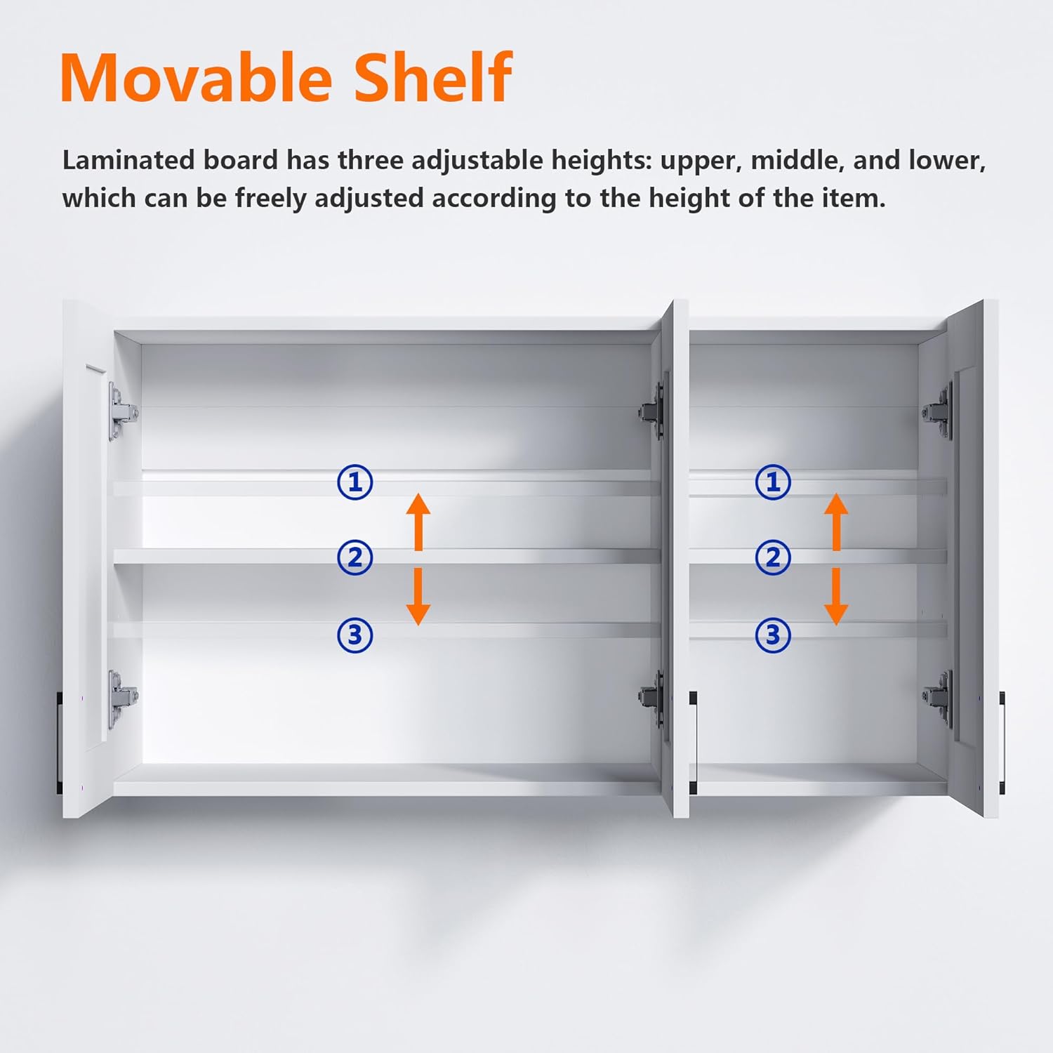 - ▶ Adjustable shelves:Wall cabinet shelves are adjustable in 3 sections, allowing for free height adjustment according to needs, greatly increasing the practicality of the product.