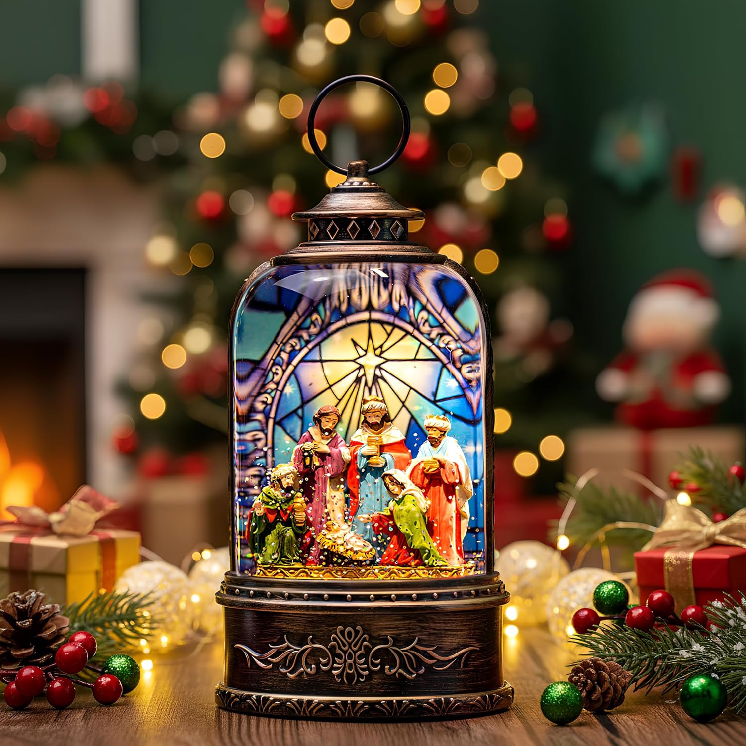 - 🎅🎄【Nativity Figurines Lantern】The Holy Family Figurines Scene design, When turned on a warm LED shines on the figurine and swirling glitter to gives our Christmas globe a whimsical look for the Christmas Holiday season.