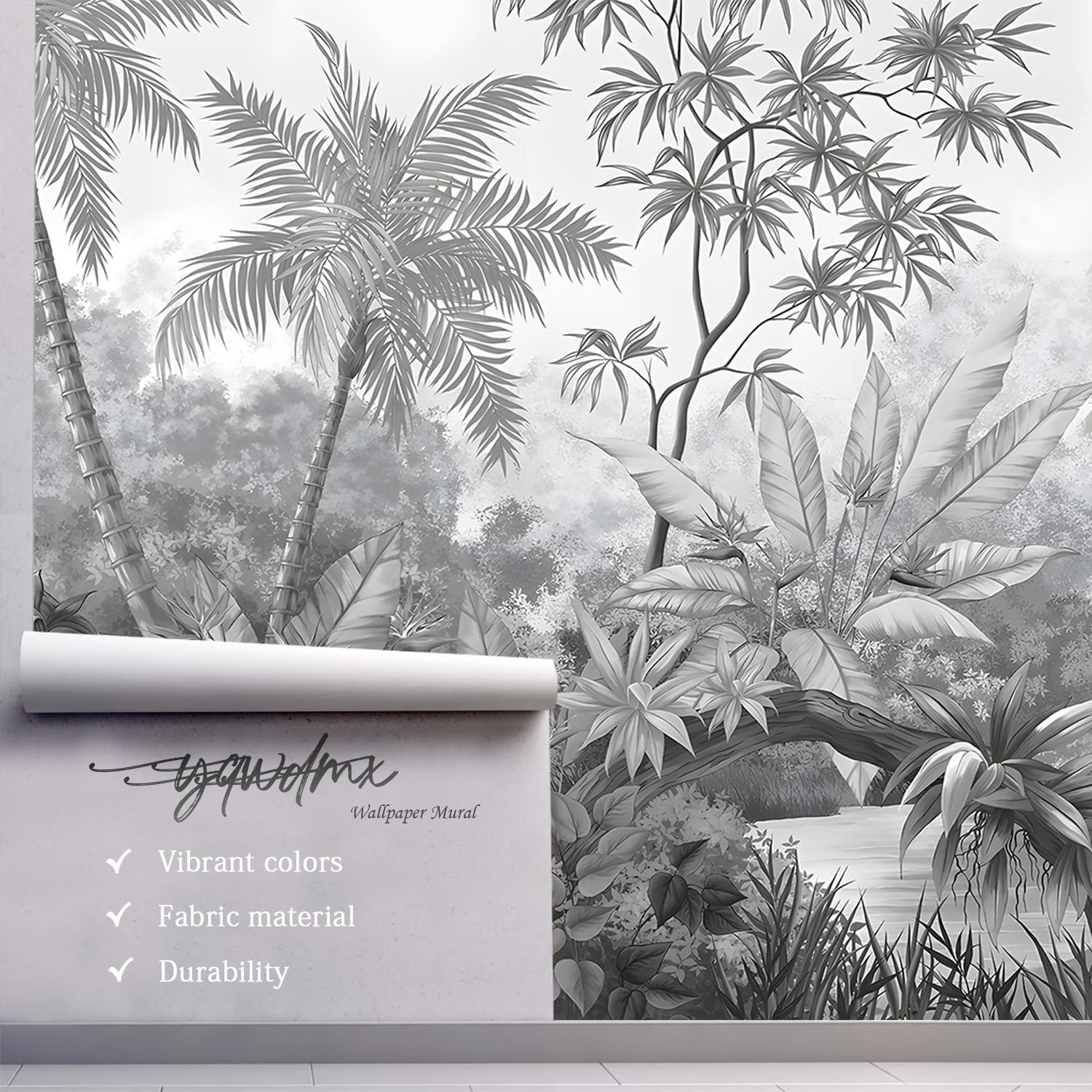 -Grey Rainforest Leaves Fabric Wallpaper Bedroom XT11 S 100" x 65"