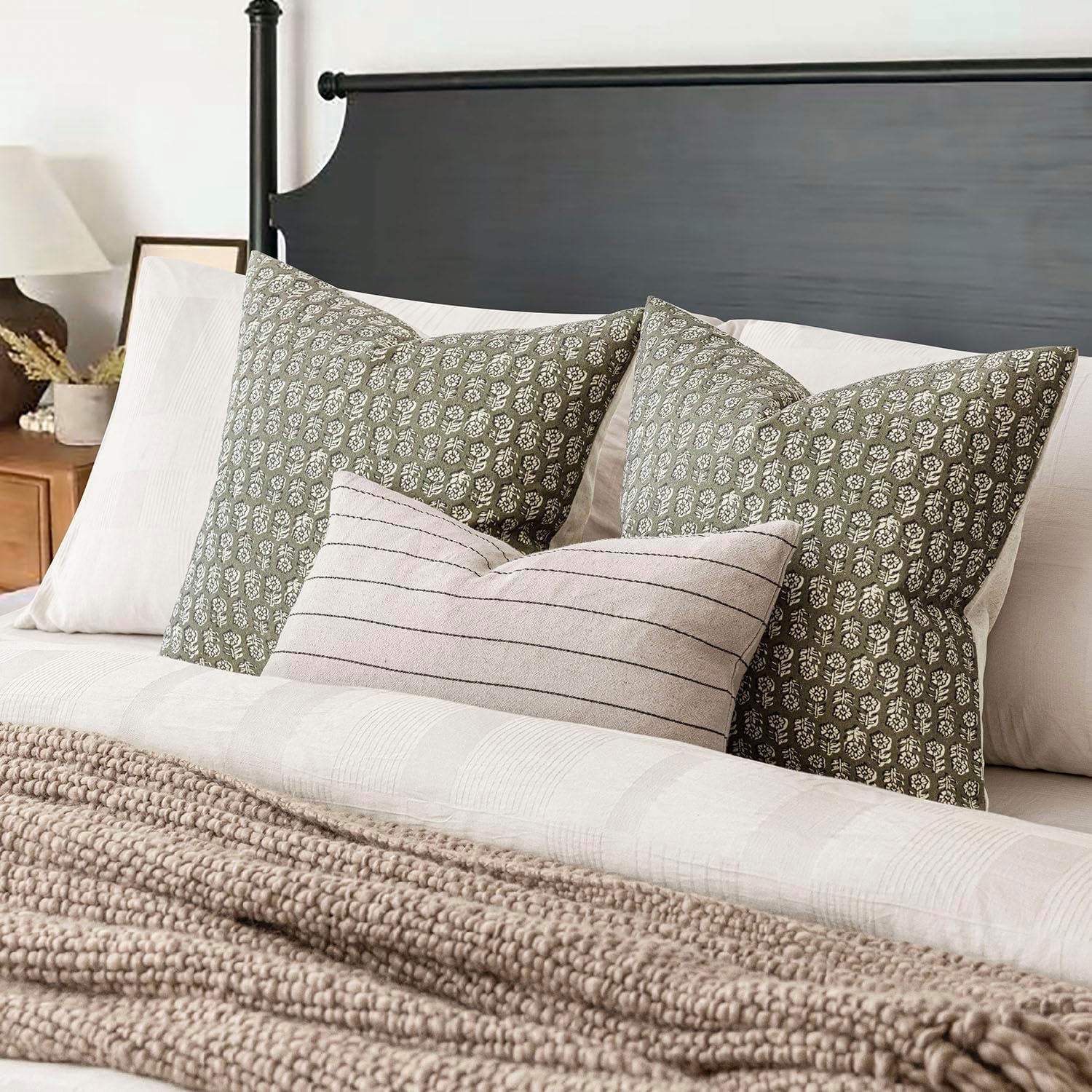 Foindtower Set of 2 Decorative Neutral Floral Print Throw Pillow Covers Vintage Accent Farmhouse Cushion Covers Boho Home Decor for Sofa Couch Chair Bedroom Living Room Outdoor,20×20 Inch,Sage Green
