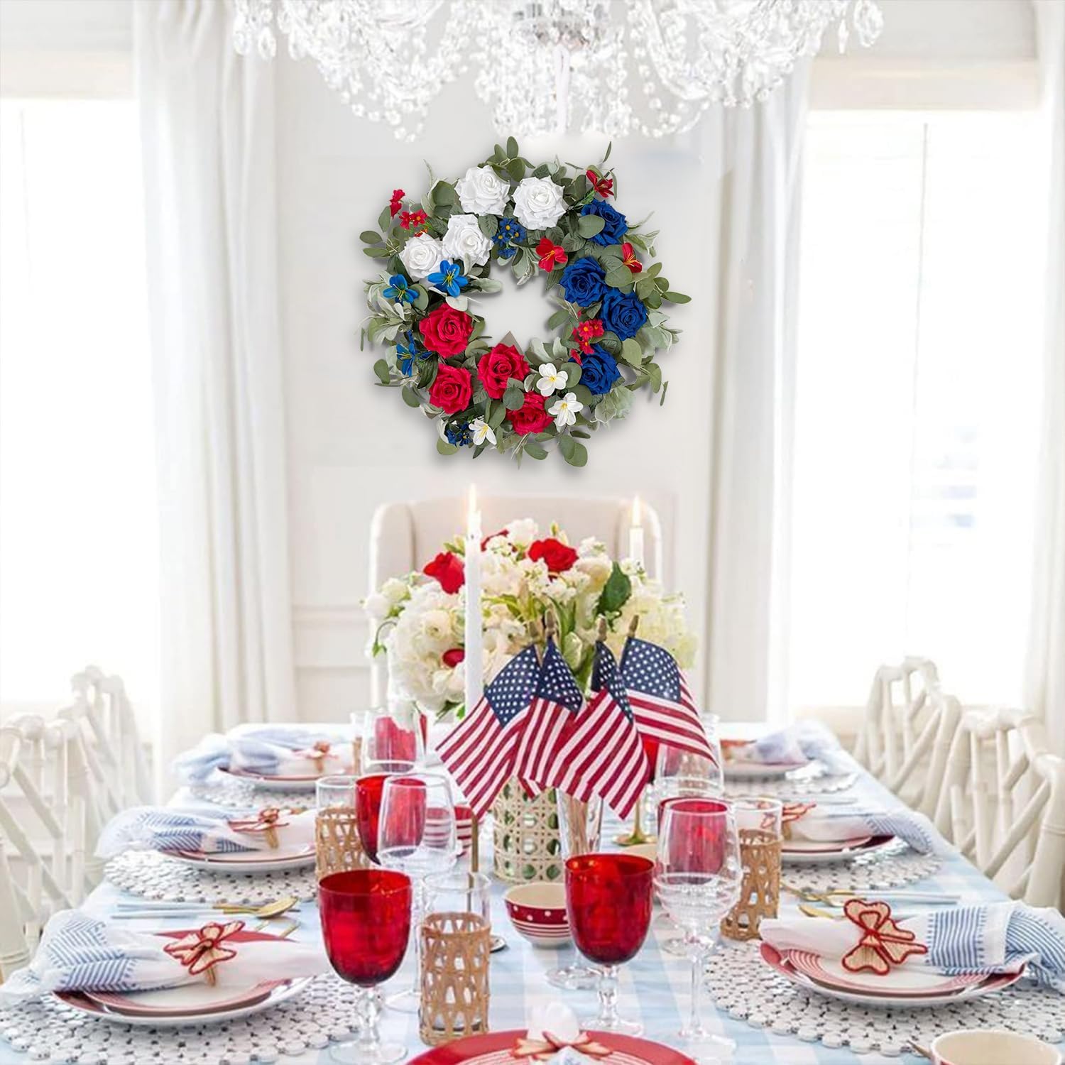 WANNA-CUL Patriotic Wreath Decorations, 24 Inch Rose 4th of July Wreaths for Front Door, Red White Blue Spring Door Wreath for Independence Day, Memorial Day for Indoor Outdoor Decor
