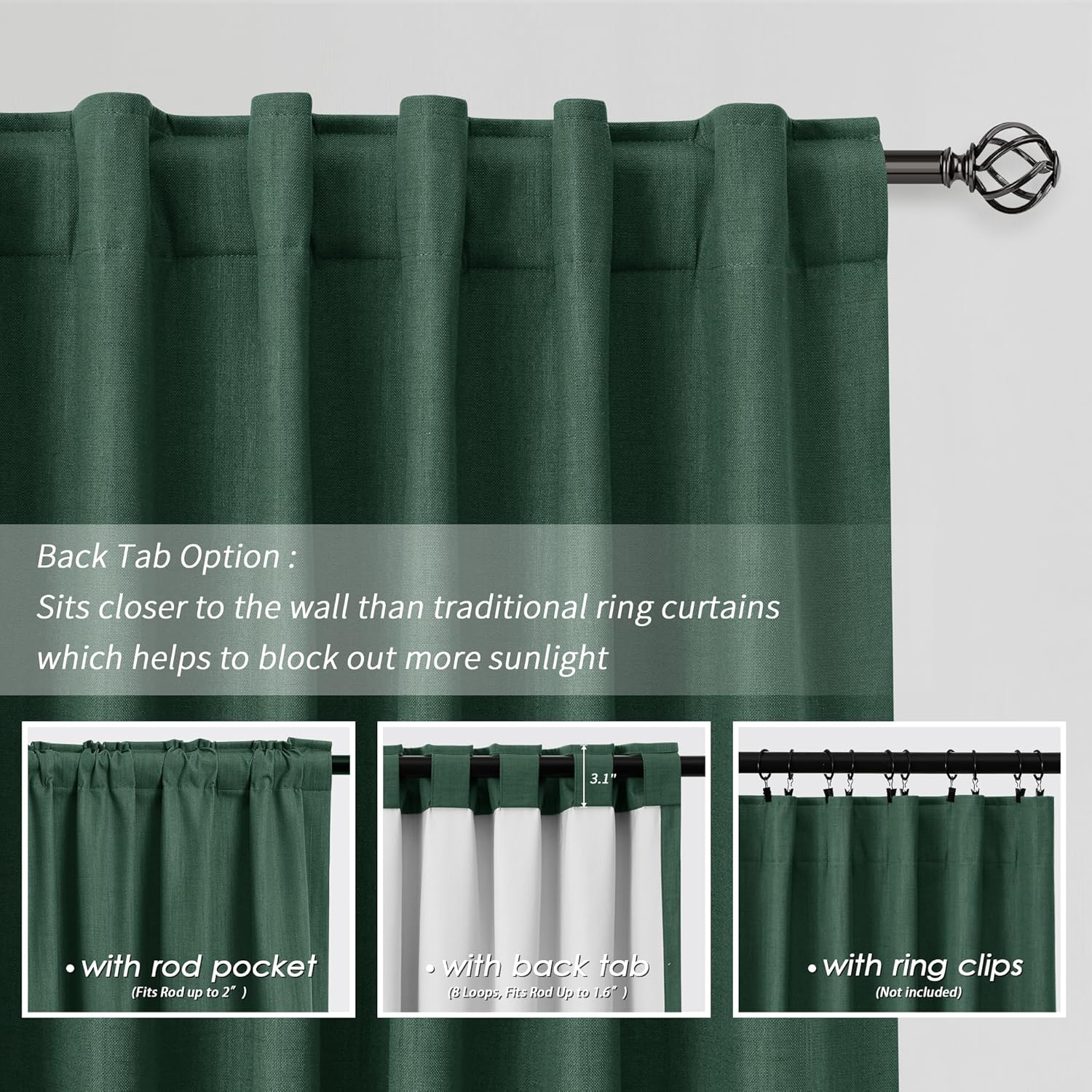 - 3 Hanging Options: Differ from the traditional curtains with grommet, BOODII linen curtains with back tab and rod pocket can full block sunlight fully. (1) Using the back tabs design to create an elegant pleated look and sit closer to the wall than traditional ring curtains, which helps to block out more sunlight; (2) Using rod pocket for a classic effect; (3) Using clip rings on track system or curtain rod, slide open/closed easily (clip rings are not included).