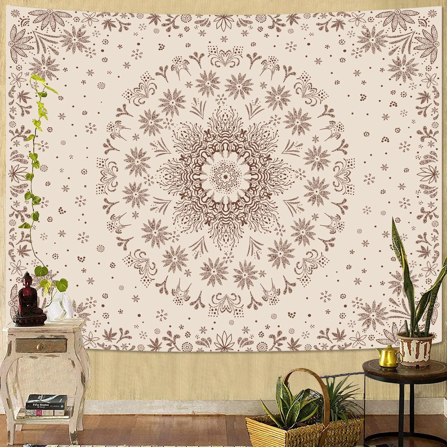 Fowocu Boho Floral Mandala Tapestry Wall Hanging Bohemian Flower Medallion Tapestry Aesthetic Beige Brown Hippie Indian Small Tapestries for Bedroom Living Room Dorm Decor 80 x 60 Inch
