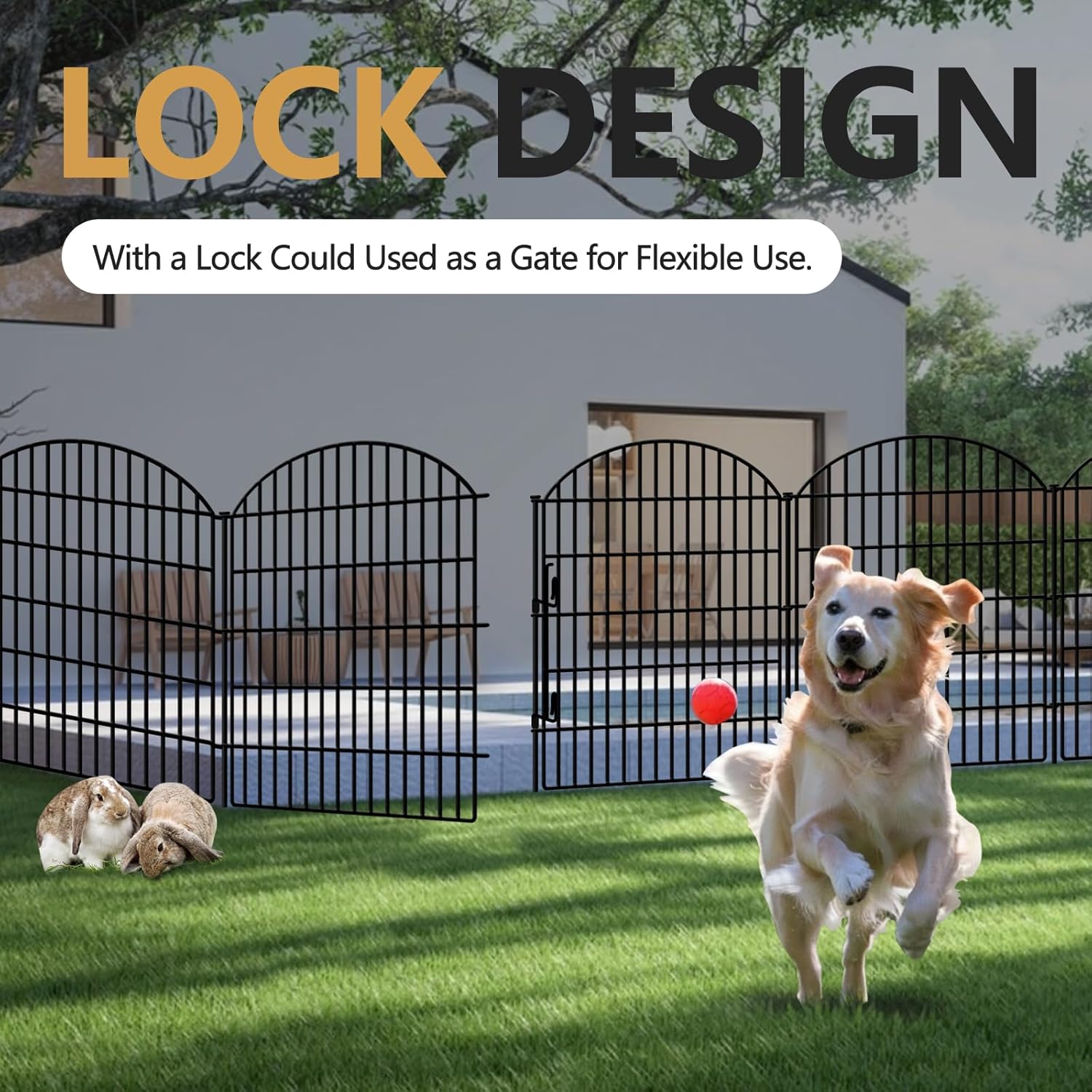 - MORE AVAILABLE SIZE: The classic arch shape design garden fence single piece measures 26.77" wide, 33" high, 1.5" gap. Comes with 11 metal stakes are 44" in height, which can be inserted into about 12.6 inches above the ground, making it strong enough to prevent animals from entering & leaving, dog digging, and even keep rabbits away from your plants. A total of 10 fence panels with a lock, connecting 11 fence stakes, the total length of the garden fence is approximately 21.92 ft.