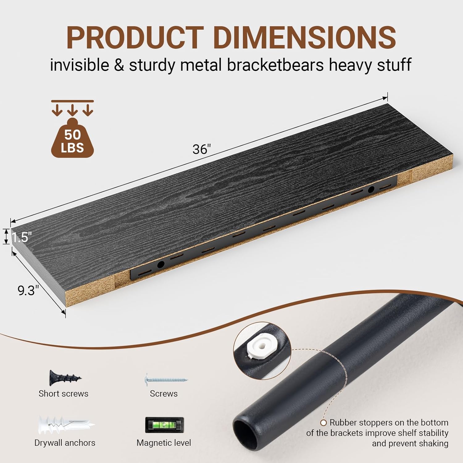- ăLonger DesignăOur pretty 36 inch wall shelves are 36"W x 9.3"D x 1.5"H.Our black shelves for wall is longer than traditional designs and can hold more items.The 36 inch floating shelf optimize wall space,helping organize essentials without taking up floor space in your home.