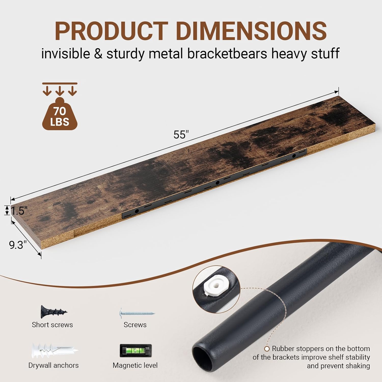 - ăLonger DesignăOur pretty wall shelves are 55"W x 9.3"D x 1.5"H.Our brown floating shelves is longer than traditional designs and can hold more items.The rustic brown floating shelves optimize wall space,helping organize essentials without taking up floor space in your home.