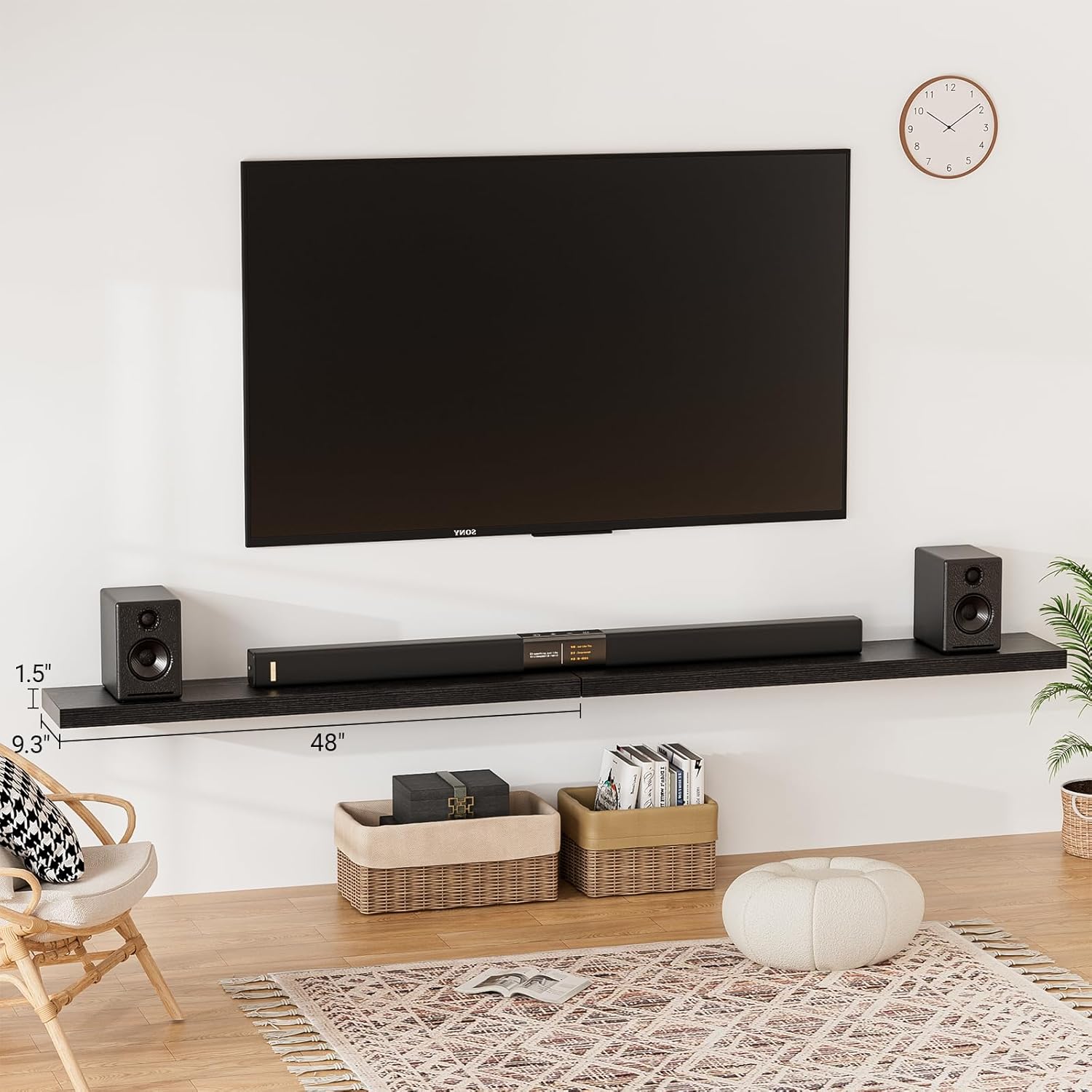 - ăLonger DesignăOur pretty black floating shelves are 48"W x 9.3"D x 1.5"H.Our wall shelf is longer than traditional designs and can hold more items.The black shelves for wall optimize wall space,helping organize essentials without taking up floor space in your home.