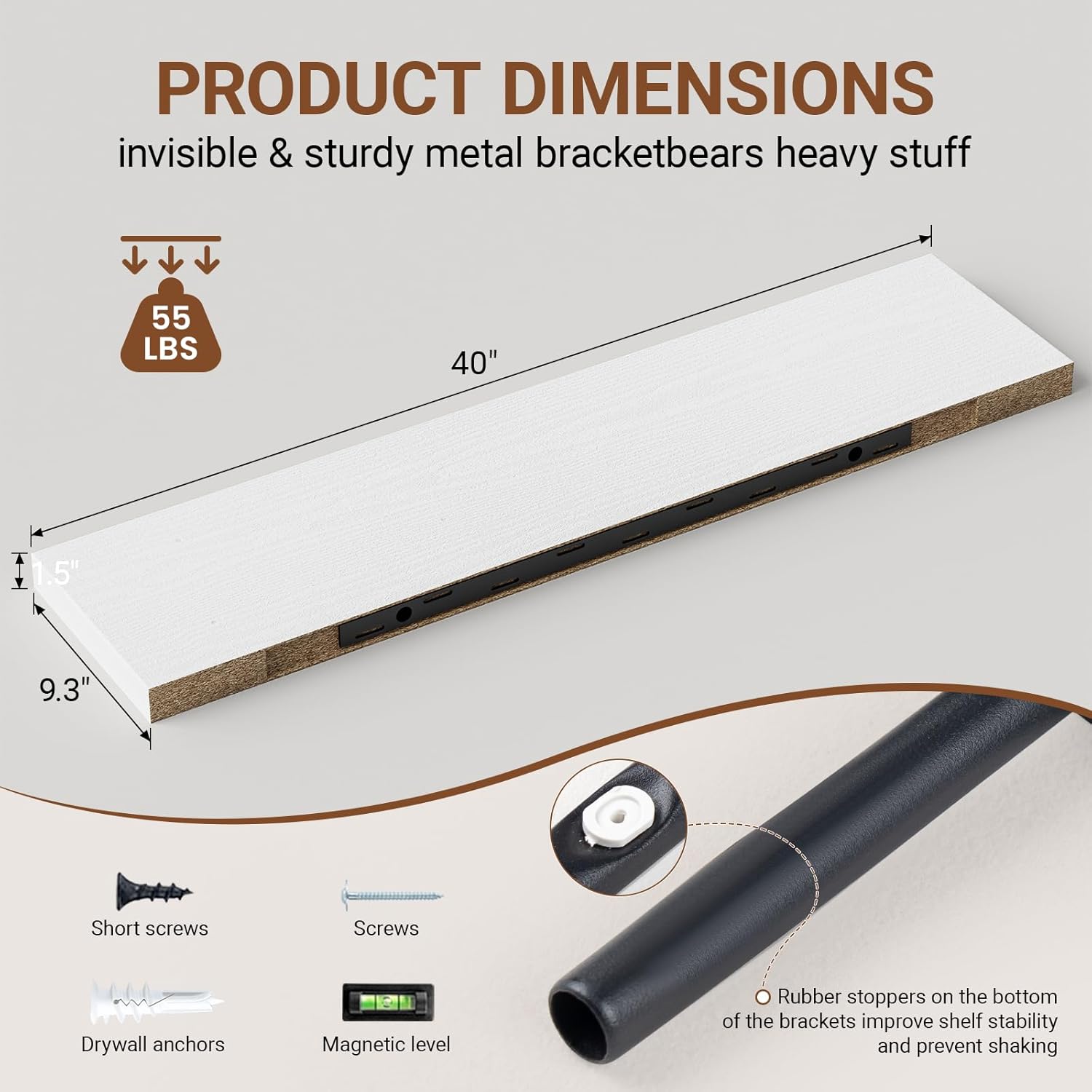 • 【Longer Design】Our pretty white wall shelves are 40"W x 9.3"D x 1.5"H.Our white floating shelves is longer than traditional designs and can hold more items.The white floating shelf optimize wall space,helping organize essentials without taking up floor space in your home.