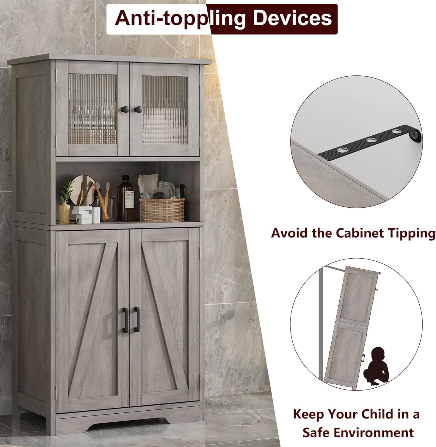 - Farmhouse Versatile Design: Enhance your home's aesthetic with this beautifully crafted bathroom storage cabinet. Featuring elegant glass doors and a charming farmhouse barn panel, it seamlessly complements any decor style, whether placed in the bathroom, living room, kitchen, or dining room