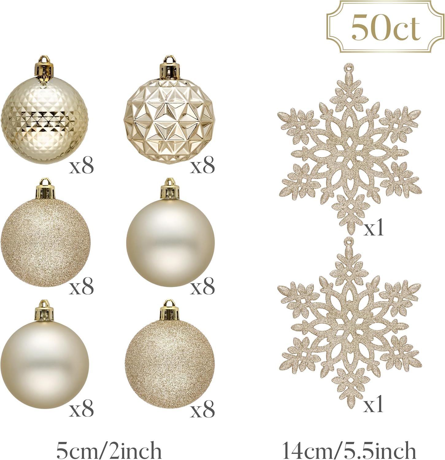 - 【Package and Size】This ornament ball set include 50pcs Christmas ornaments measuring 2 inches in diameter, featuring seamless connections for a polished look