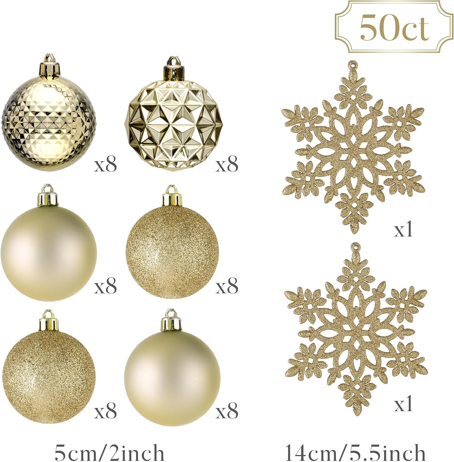 - 【Package and Size】This ornament ball set include 50pcs Christmas ornaments measuring 2 inches in diameter, featuring seamless connections for a polished look