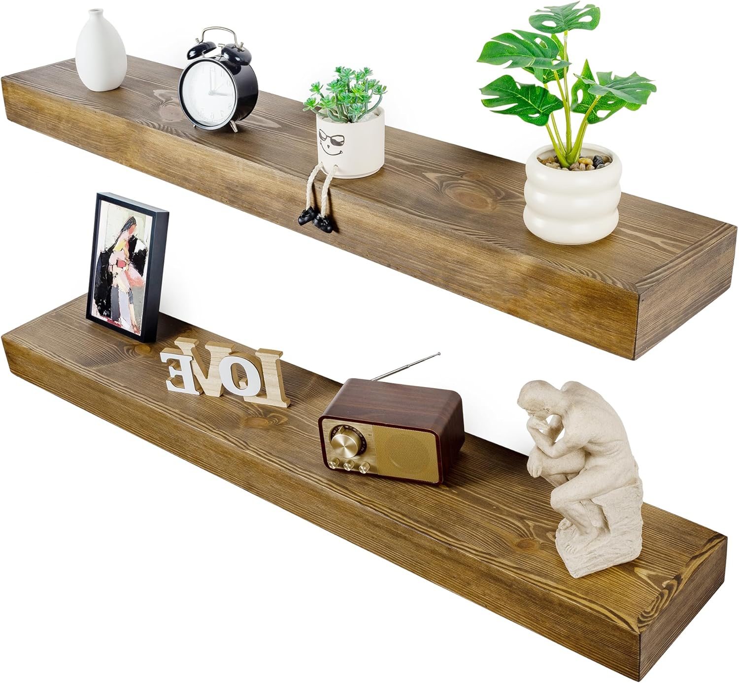 • Premium Handcrafted Solid Wood Shelves: Our floating shelves are made from 100% real solid pine wood, handcrafted to showcase the natural grain and unique knots of the wood. The rustic stain adds a timeless farmhouse charm, enhancing any home decor.