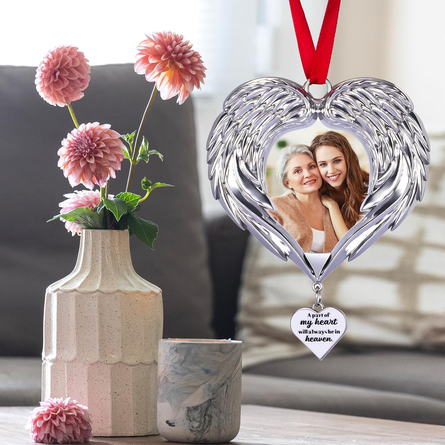 - ANGEL WINGS MEMORIAL PHOTO ORNAMENT - Whether youโre dealing with the struggle of losing a loved one or you simply want to provide comfort and support to your mother, grandmother or friend for their important loss, this memorial picture frame is a thoughtful and unique touch for your Christmas tree.