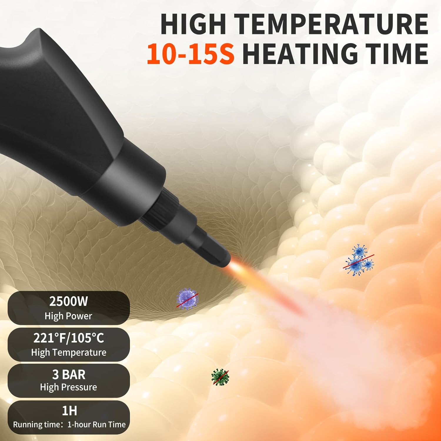 - ใ๐๐ข๐ ๐ก ๐๐ซ๐๐ฌ๐ฌ๐ฎ๐ซ๐ ๐๐ญ๐๐๐ฆ ๐๐ฅ๐๐๐ง๐๐ซใ: The high pressure steam cleaner with 2,500 watts of power that produces 221ยฐF high temperature in just 10โ15 seconds, and release 3Bar high pressure, effectively cleaning stubborn greasy dirt and stains. 100% chemical-free, no harmful fumes , the steam cleaner ensures the health of your family and pets.