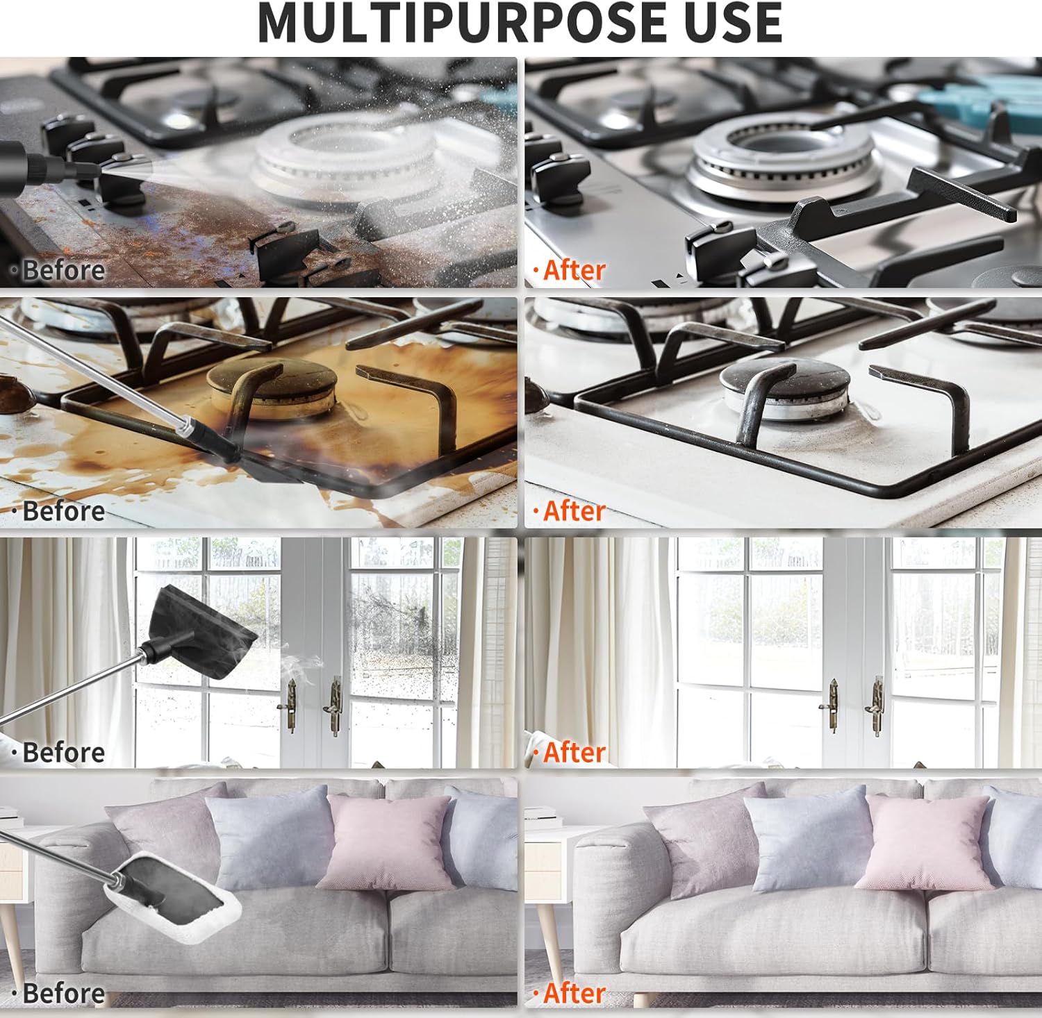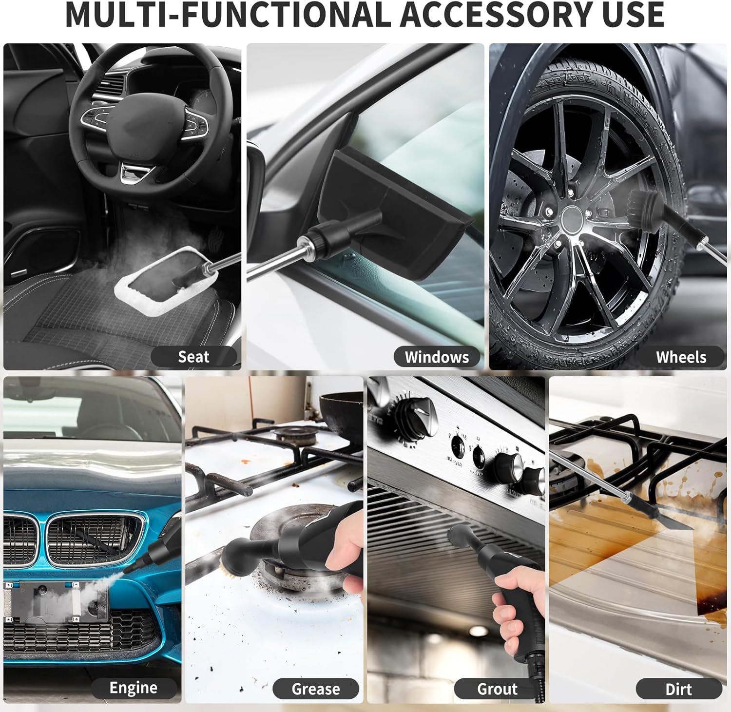 - ใ๐๐ฎ๐ฅ๐ญ๐ข-๐ฉ๐ฎ๐ซ๐ฉ๐จ๐ฌ๐ & ๐๐ฎ๐ฅ๐ญ๐ข-๐๐๐๐๐ฌ๐ฌ๐จ๐ซ๐ฒใ: The steam cleaner for home comes with 17 accessories including 2*Small nylon brush, 2*Brass brushes, 2*Big nylon brush, 1*High pressure nozzle, 1*Glass scraper,2*Towel sleeve, 1*Extension pole, 2*rubber rings, 2*Trowels, 1*Gloves, and 1*Towel, the steam cleaner can use different brushes according to cleaning required. Also, the handheld steam cleaner features a steam pipe, power cord and extension tube. Very suitable for cleaning kitchens, cars, tiles, car interiors, and furniture.