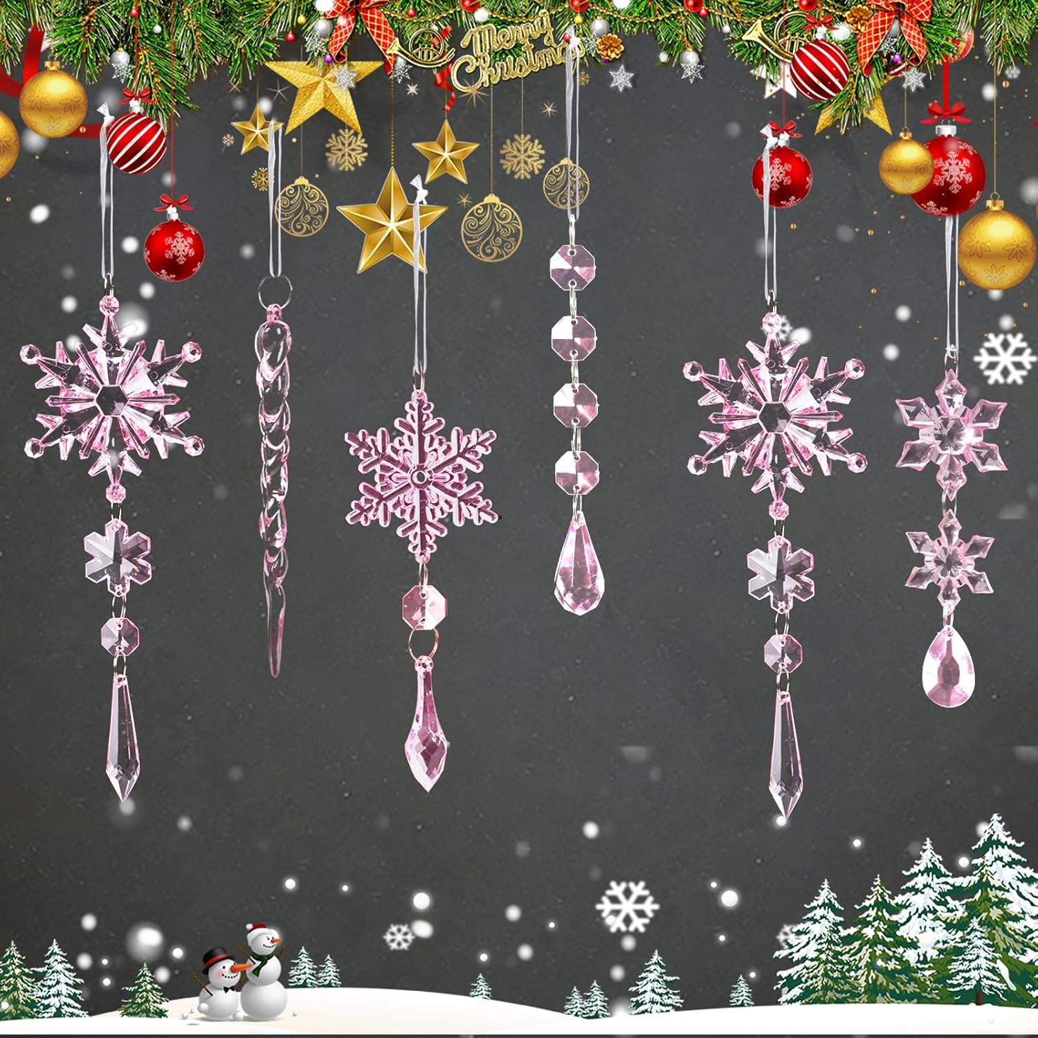 - Package: You will receive a great value pack of 18 pieces pink acrylic Christmas ornaments set in 5 styles, including 8pcs unique designed snowflakes ornaments (5.2", 5.3" and 7.64"), 5pcs 5.3" crystal icicles ornaments and 5pcs 5" bead garlands.