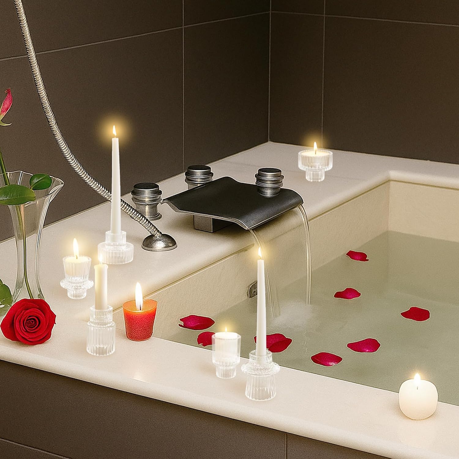- DUAL-SIDED GLASS CANDLE HOLDERS: These reversible taper glass candlestick holders by Coolsheepsia effortlessly accommodate various candle shapes and sizes, including taper candles and tealight candles. The ingenious dual-open design (12PCS set) offers ultimate flexibility for your candle holders for candlesticks needs, making them true multifunctional candle stick holders