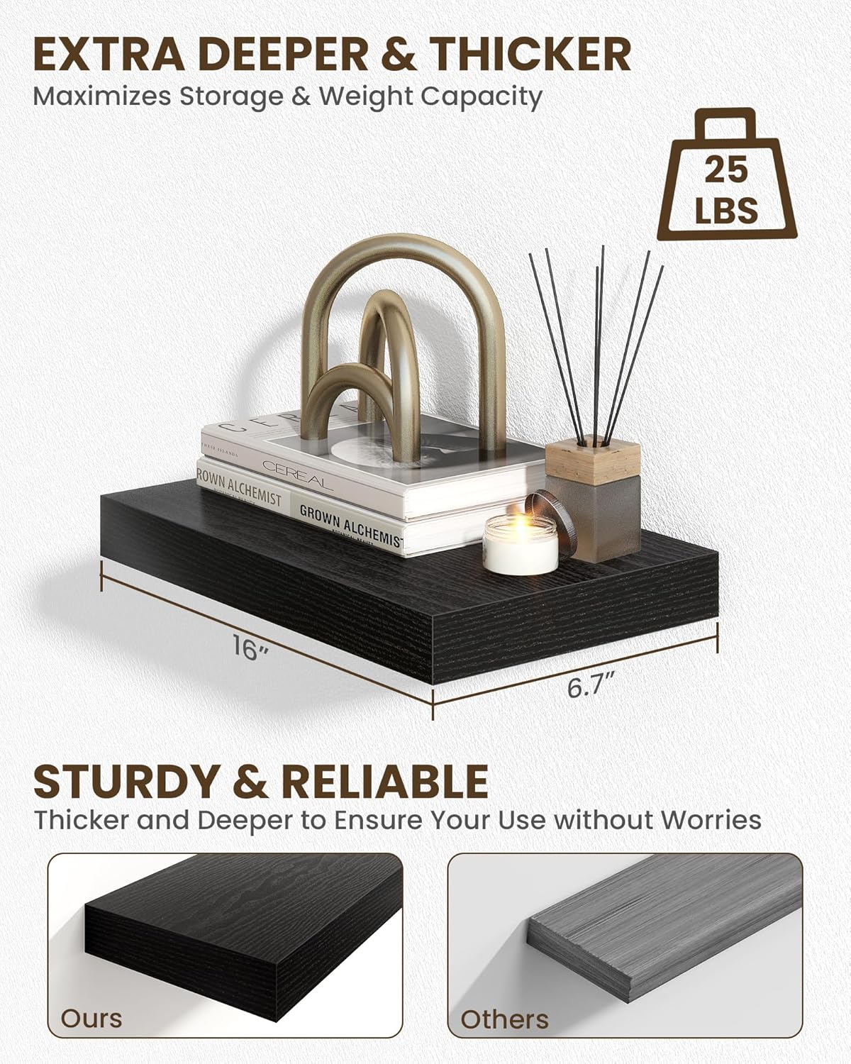 - Sturdy & Reliable: Robust construction floating shelves for wall supports everyday items (books, decor, bathroom essentials, kitchen spices) with stability, combining practicality with timeless style