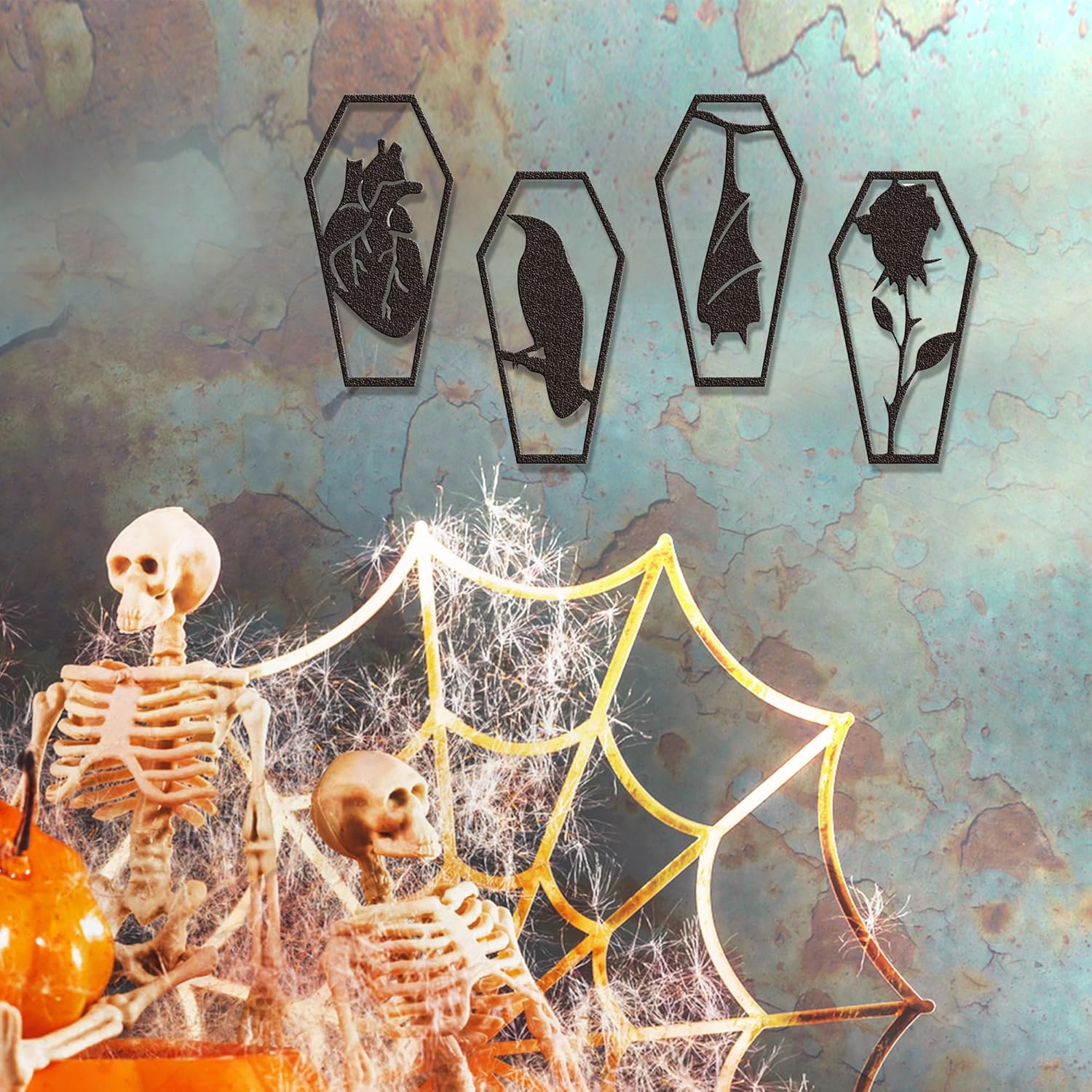 YATEASLU Gothic Coffin Wall Decor Set of 4 Metal Heart, Crow, Bat, Rose Sculptures for Gothic Home Decor, Bathroom, Kitchen, Office - Spooky Halloween Wall Decor with Screws