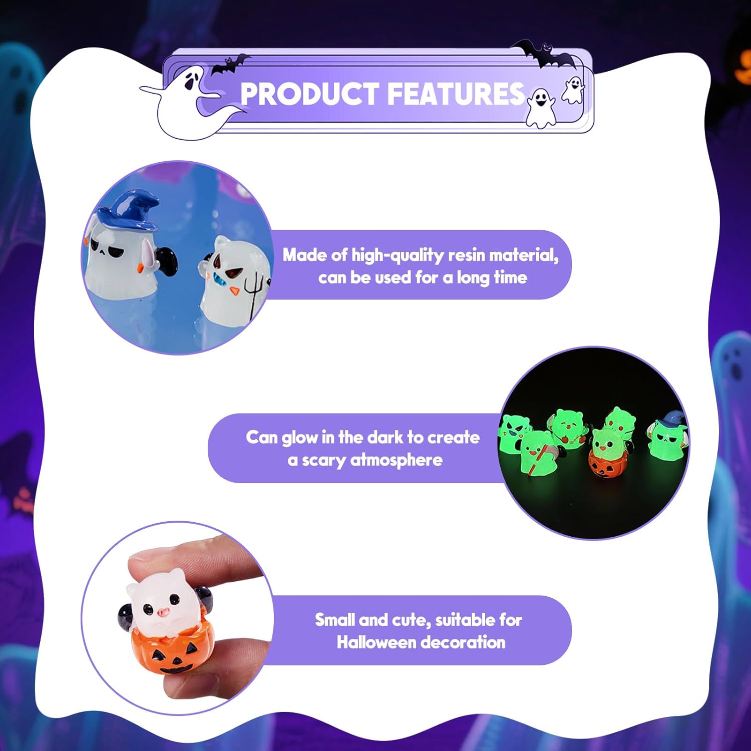 - Charming Design: Illuminate your space with our Halloween Ghost Glow in The Dark Figurine, designed to add a charming touch to any decor while providing a spooky glow at night.
