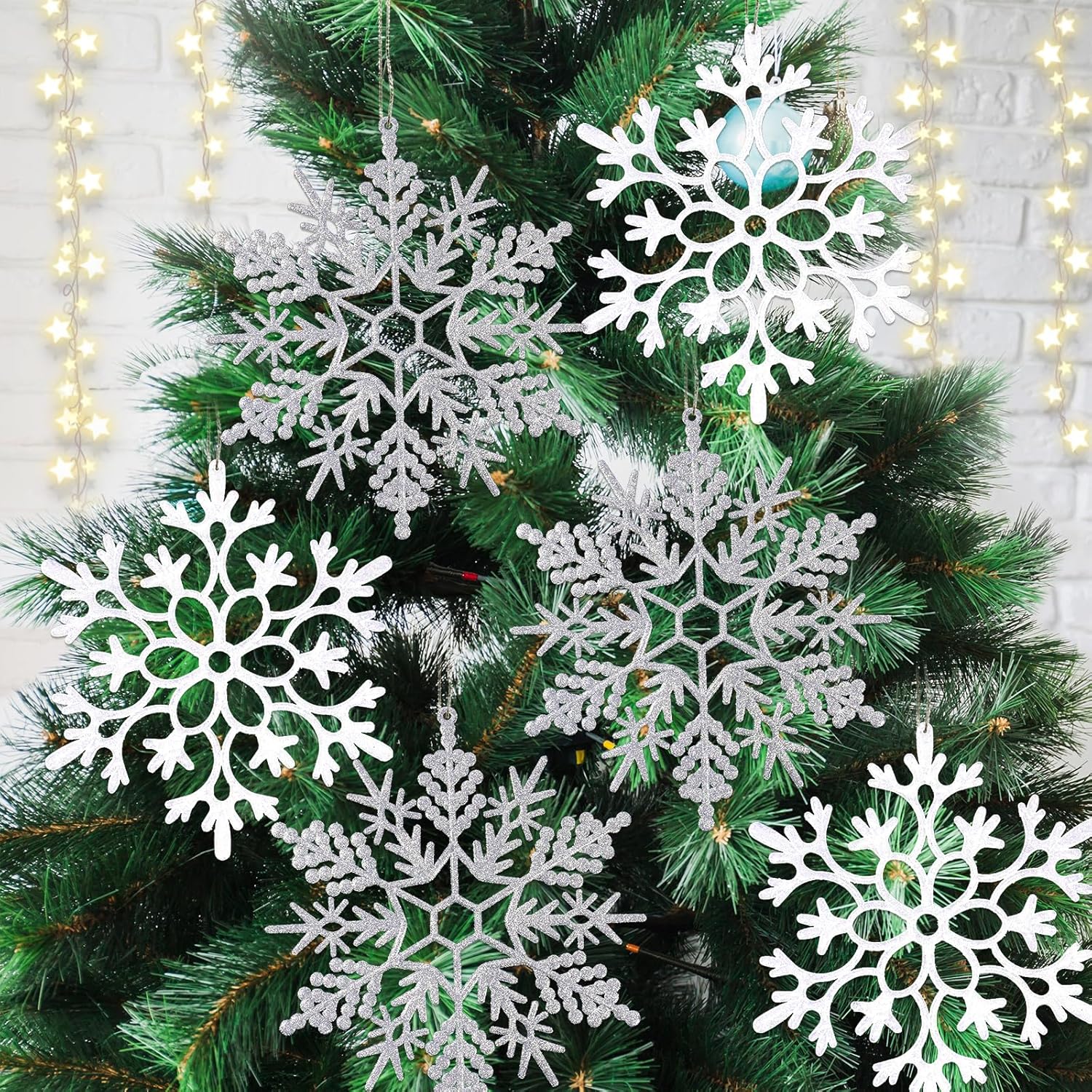- Premium Snowflakes: These stunning white sliver snowflakes are crafted from high-quality plastic with a dazzling shimmer. Their durable design allows for years of reuse while maintaining perfect shape. The glitter is securely adhered and resists flaking, making them an ideal choice for Christmas tree decorations