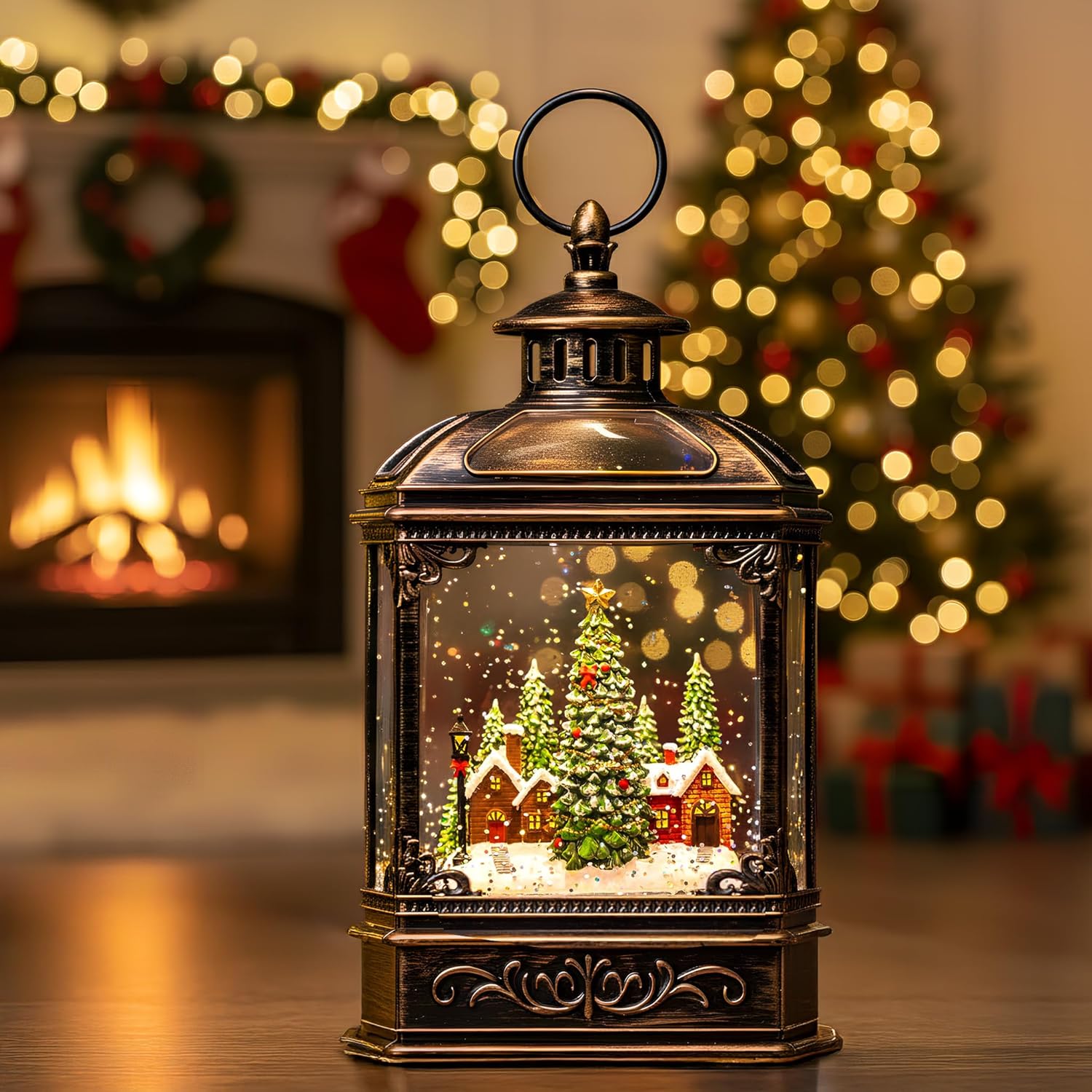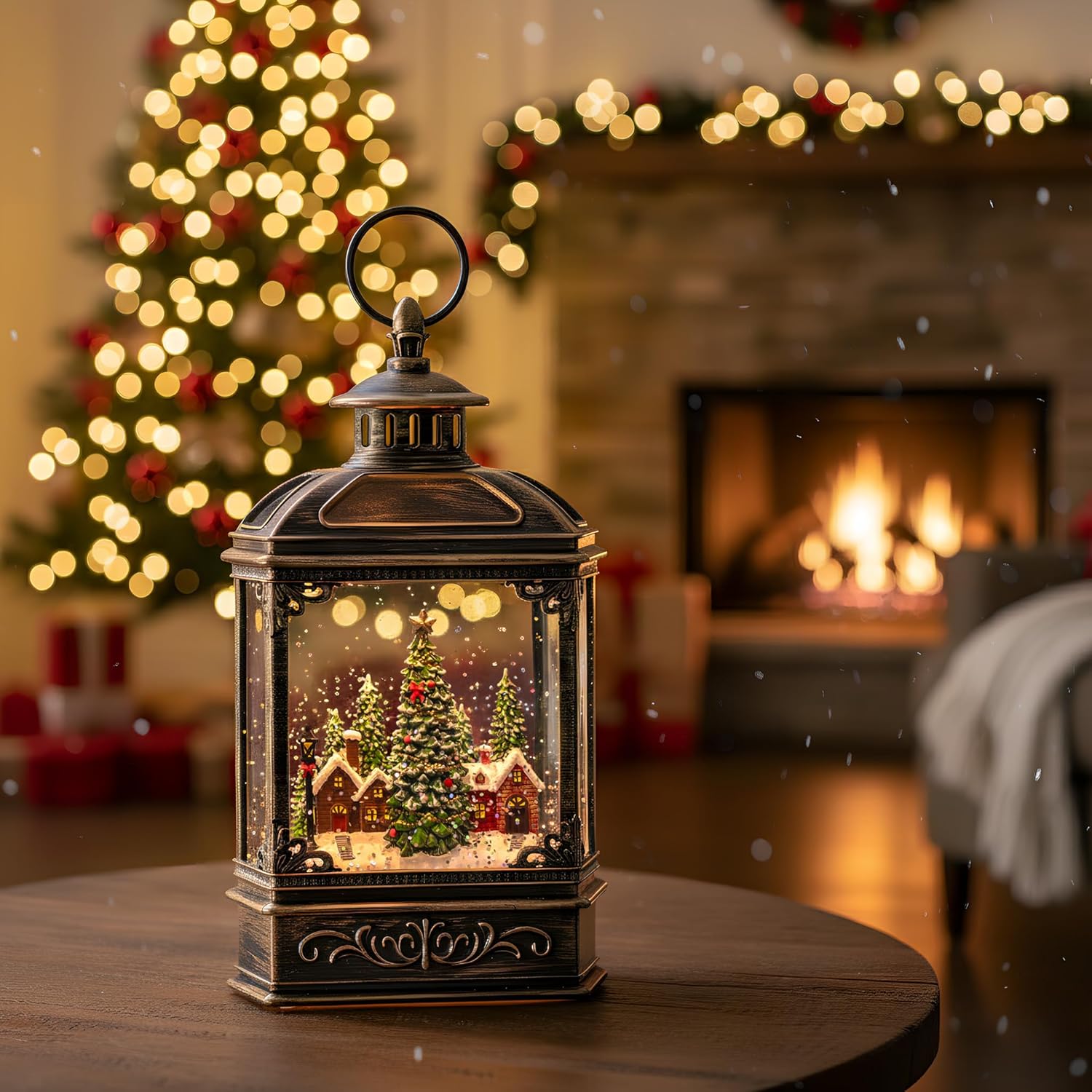 Christmas Snow Globe Lantern Water Glittering Xmas Village with Music & Timer, USB Lined/Battery Operated Lighted Lantern for Christmas Festival Decoration Gifts