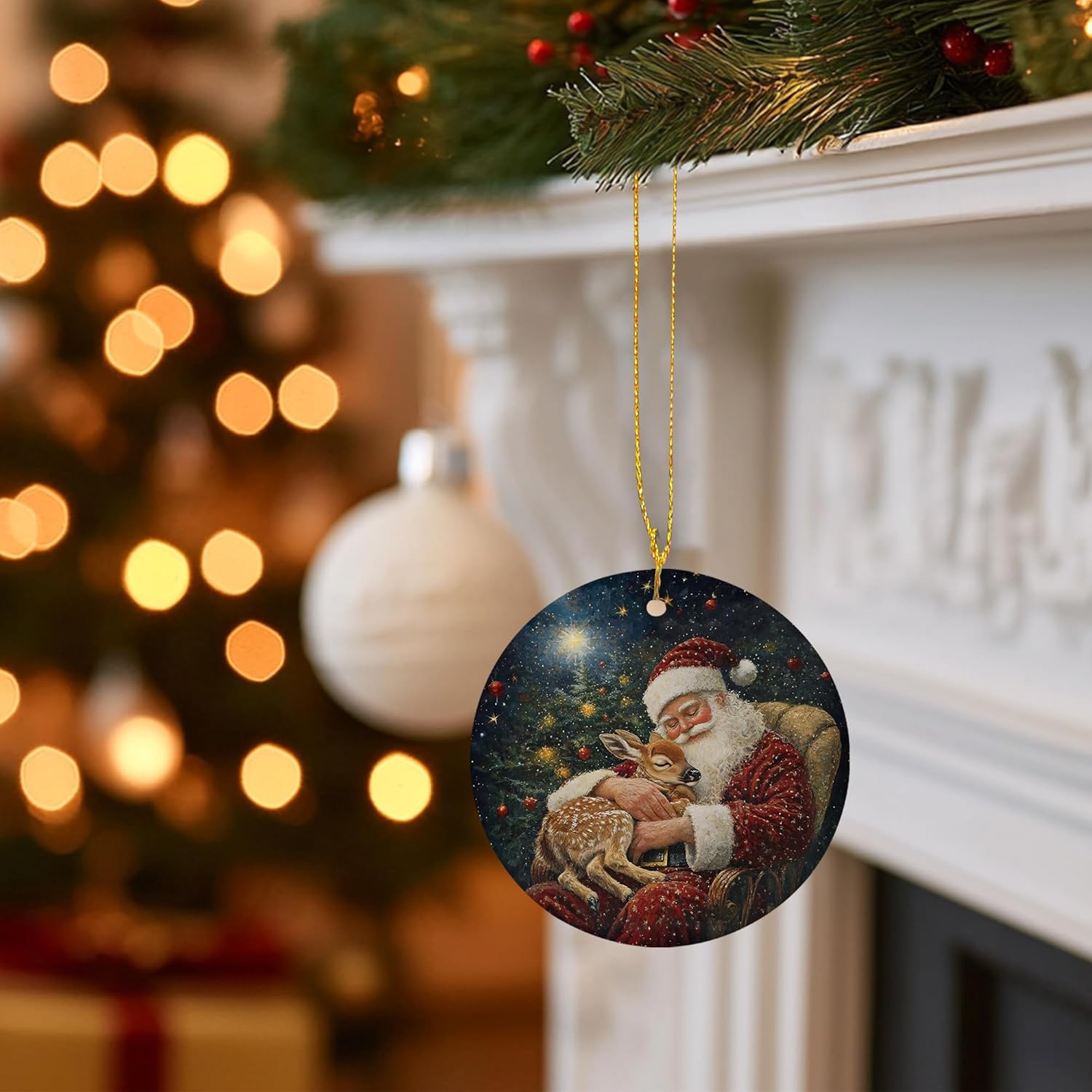 Vintage Christmas Santa Deer Ceramic Ornament Gifts, Rustic Winter Christmas Decorative Hanging Ornaments for Xmas Tree Holiday Party Decoration, Santa Deer Xmas Tree Decorations